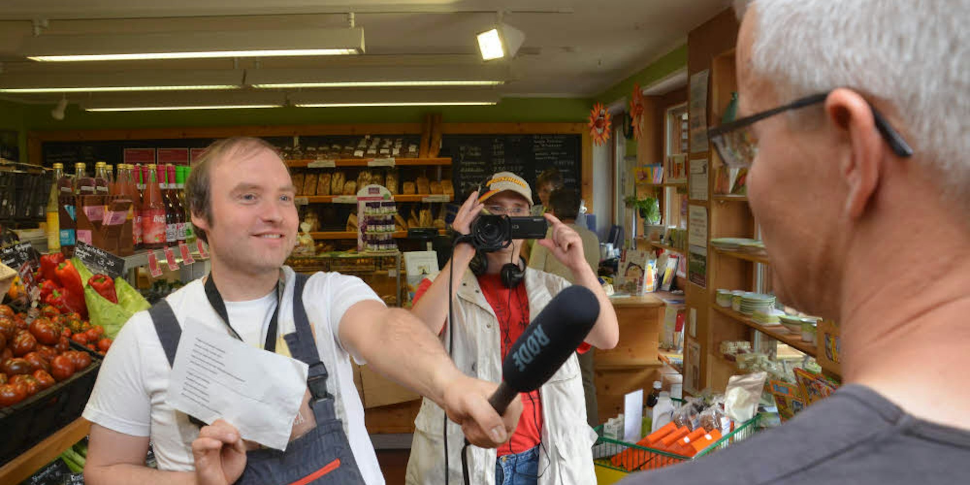 Für ihre Dreharbeiten investieren zehn Bewohner des Eichhofs zusammen mit ihrem Betreuer Jens Künstler aktuell eine Menge Zeit. Sie haben bereits in verschiedenen Bereichen des Eichhofs gedreht, Arbeitsplätze vorgestellt und eine Wohngemeinschaft besucht. Dafür geht meist Freizeit drauf. So hatte Tim Hirschmann bereits in der Backstube gestanden, bevor er am späten Vormittag mit Kollege Oehr Kamera und Mikrofon im Dorfladen auspackte.