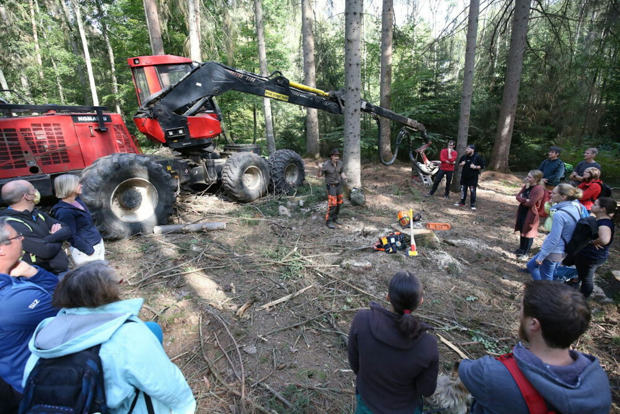 Mit dem Harvester werden im Stadtwald von Bad Honnef großflächig Fichten gefällt, die vom Borkenkäfer befallen sind, wie Forstwirt Martin Siemes erläuterte.