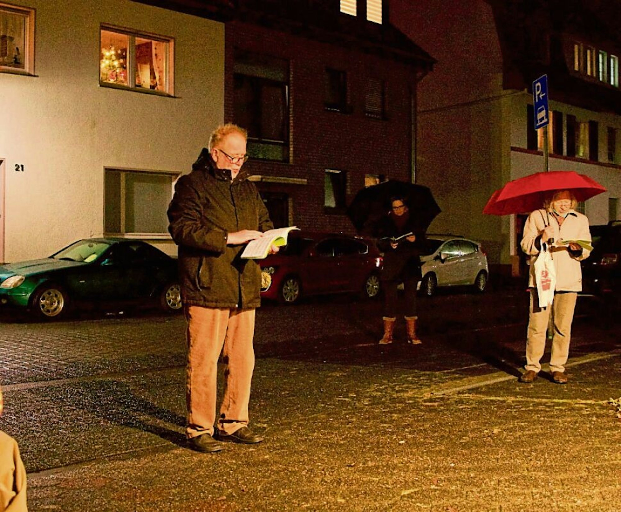 „Wir führen die Tradition der italienischen Balkonsänger fort“, sagt Vorsänger Kieseier, der sich auf die Treue der Nachbarn verlassen kann. Die kommen stets pünktlich und stimmen ein in die drei bis vier der Jahreszeit angepassten Volks-, Wander- oder Kirchenlieder. Am Montag waren es Adventslieder, und trotz des fisselichen Wetters erschienen zehn stimmsichere Gleichgesinnte.
