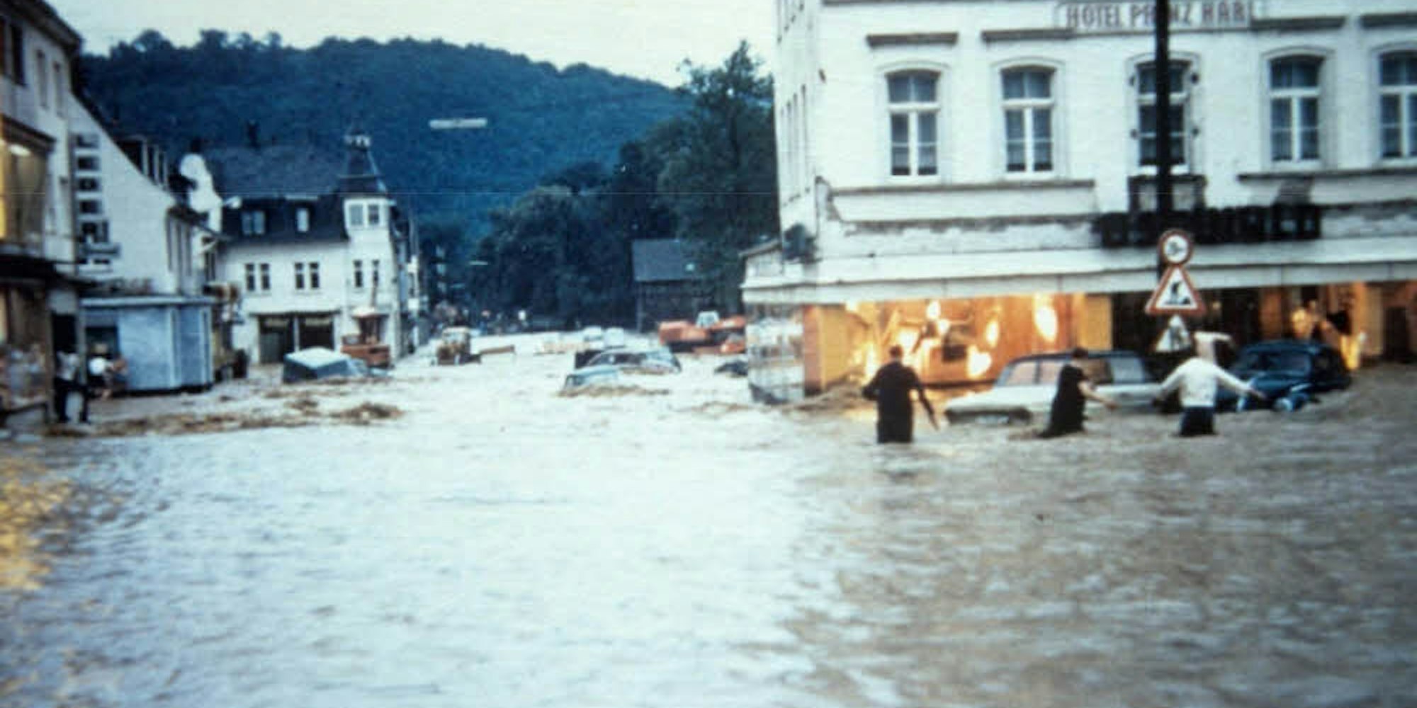 Innerhalb kürzester Zeit hatte der Eipbach am 8. Juli 1970 das Ortszentrum von Eitorf überschwemmt, Autos wurden weggespült.