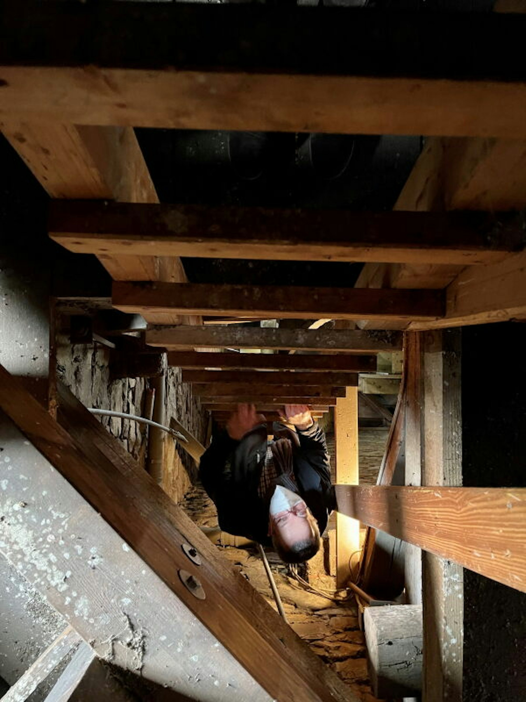 Immer wieder beeindruckt ist Küster Franke, wenn er die 100 ausgetretenen Steinstufen der engen Wendeltreppe im Turm emporsteigt, hoch über dem Kirchenschiff steile Holzleitern erklimmt, durch den schmalen Spalt zwischen Turmwand und Glockenstuhl schlüpft, auf Eichenbalken klettert und dann direkt neben der dicken, alten Dame sitzt.