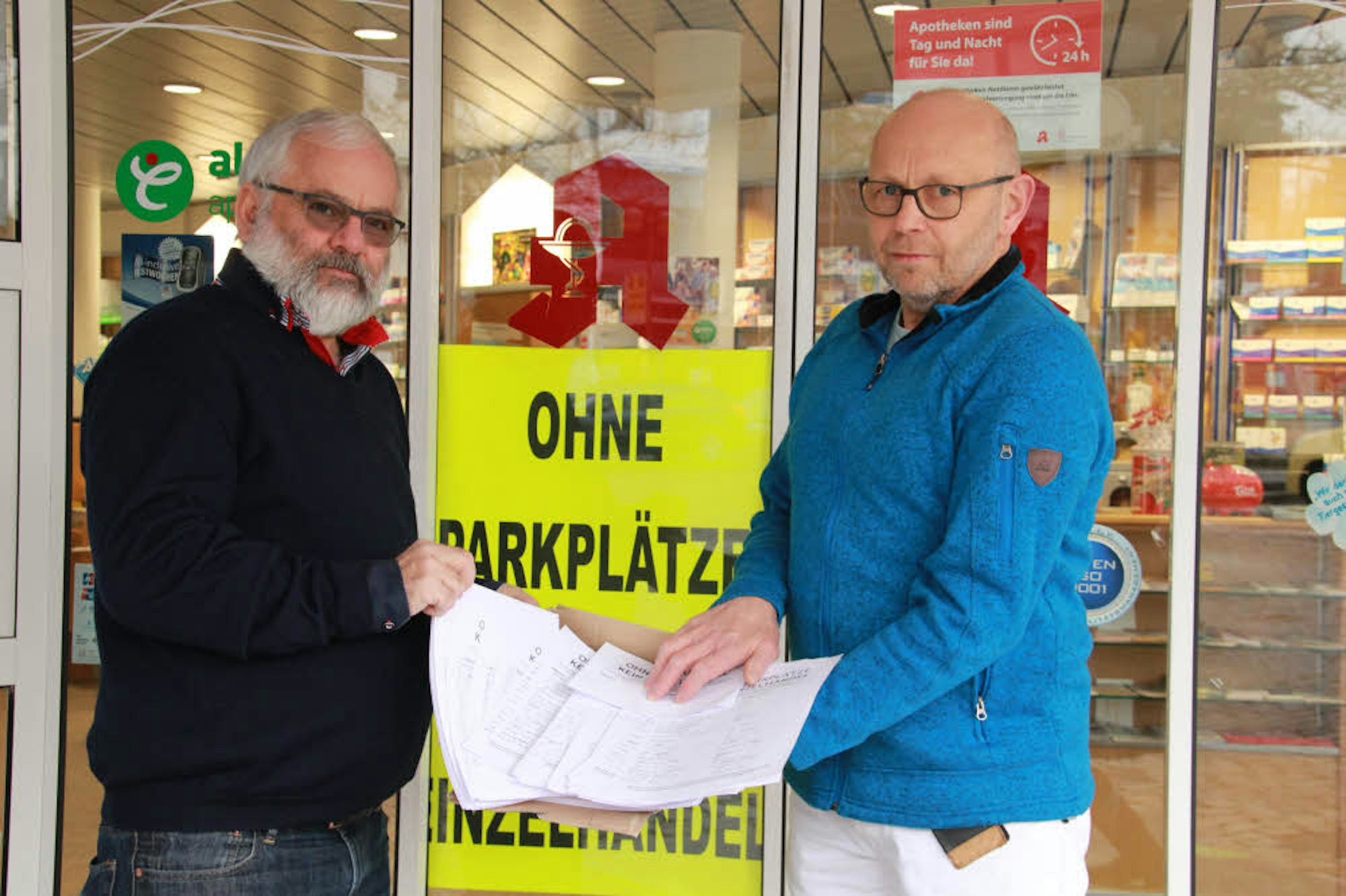 Apotheker Werner Crombach (l.) und Optiker Christoph Mirbach zeigen die gesammelten Unterschriften vor einem Protestplakat.