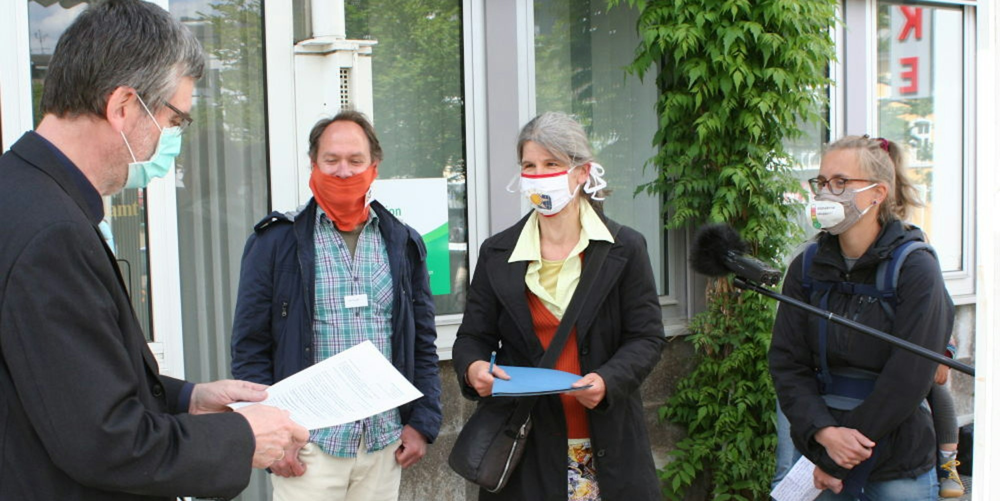 Bürgermeister Storch (links) nahm die Bürgeranregung für den Klimaschutz in Eitorf vor dem Rathaus entgegen, daneben von links Uwe Eckardt, Carmen Ulmen und Sina Pfister, die Initiatoren des Klima-Treffs.