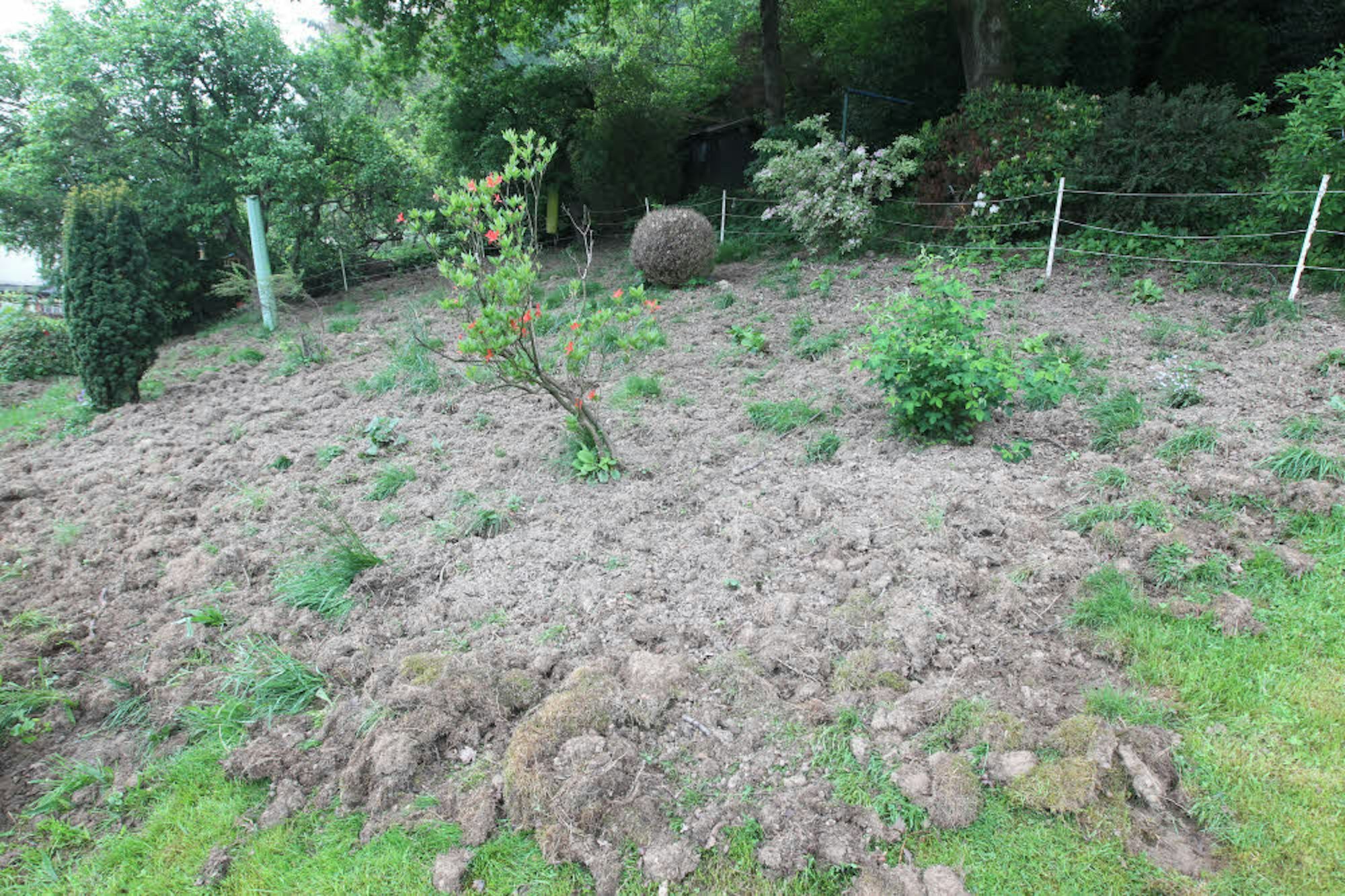 Einmal zählte sie einmal neun Tiere im Garten, der jetzt einem umgepflügten Acker gleicht. Die Rotte kam immer wieder. Jüngst flogen die ausgerissenen Grasnarben teils bis auf die Terrasse. Auch in einem Nachbargarten haben die Wildschweine mit ihren Rüsseln tiefe Furchen in den Rasen gezogen. Fotos und Videos liefern eindeutige Beweise.