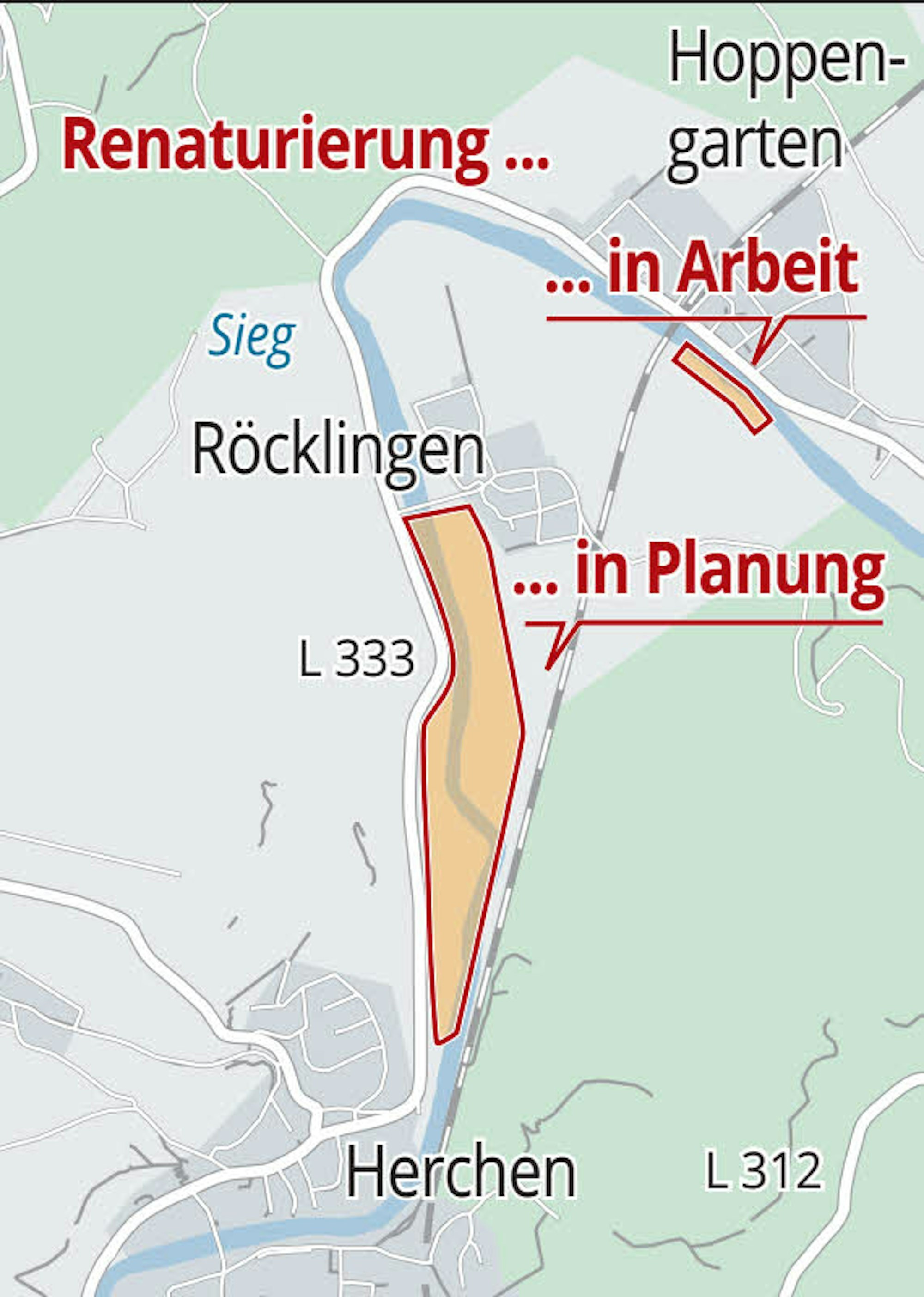 Um ihre Pläne umzusetzen und den Abschnitt der Sieg zwischen Röcklingen und Herchen nach den Vorgaben einer EU-Wasserrichtlinie zum renaturierten „Strahlpunkt“ zu machen, hatte die Bezirksregierung im Zuge einer Flurbereinigung die meisten Grundstücke dort in den Besitz des Landes überführt. Aktuell wurden dort bereits Probebohrungen durchgeführt. Die Bürger wurden darüber informiert, dass zunächst Versorgungsleitungen verlegt werden müssten, bevor die Sieg mehr Raum bekomme.