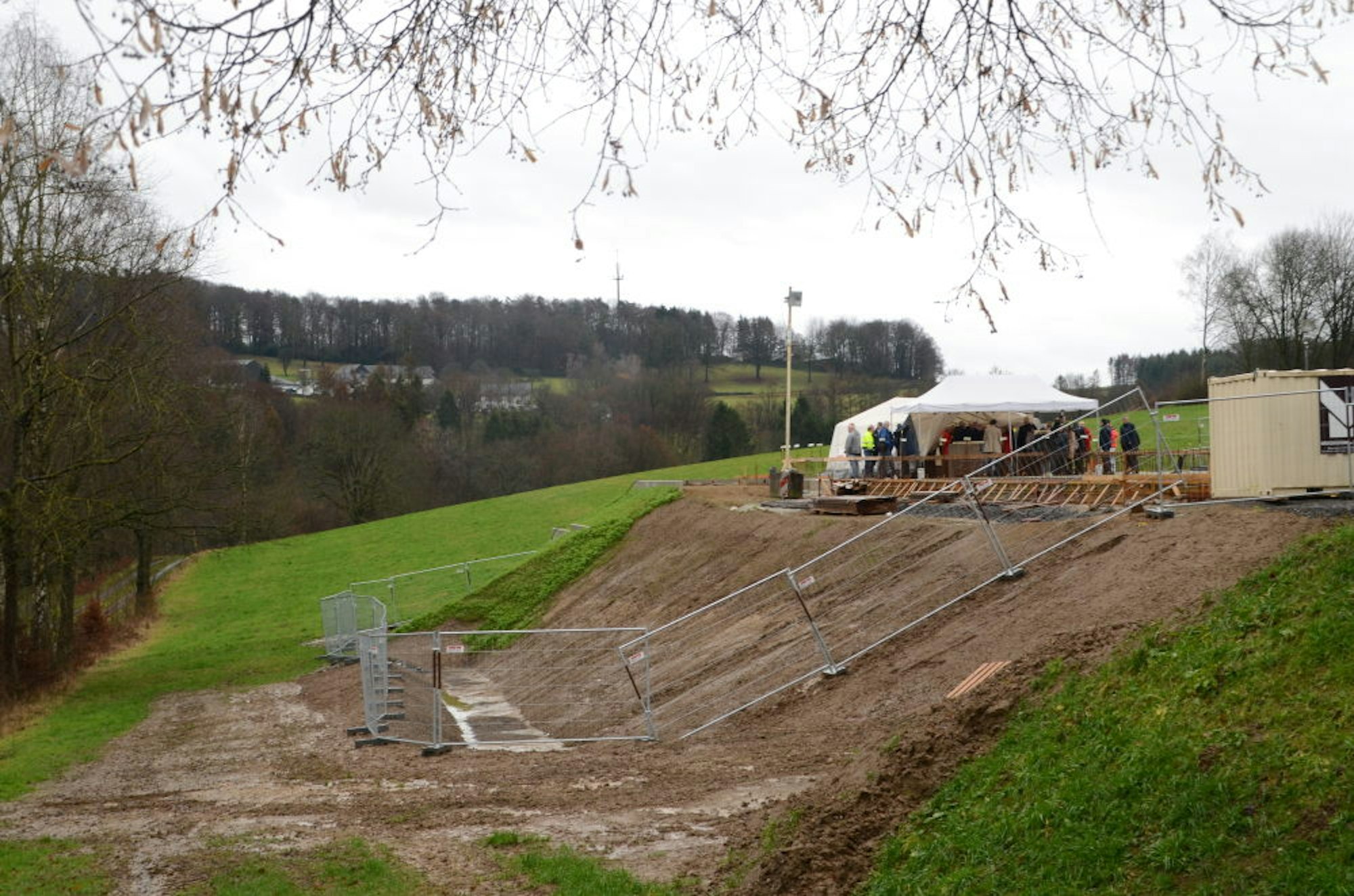 Stark abfallend ist das Gelände zwischen Burg Overbach und Niederwahn, darum wurde für den Neubau eine Flächen angeschüttet.