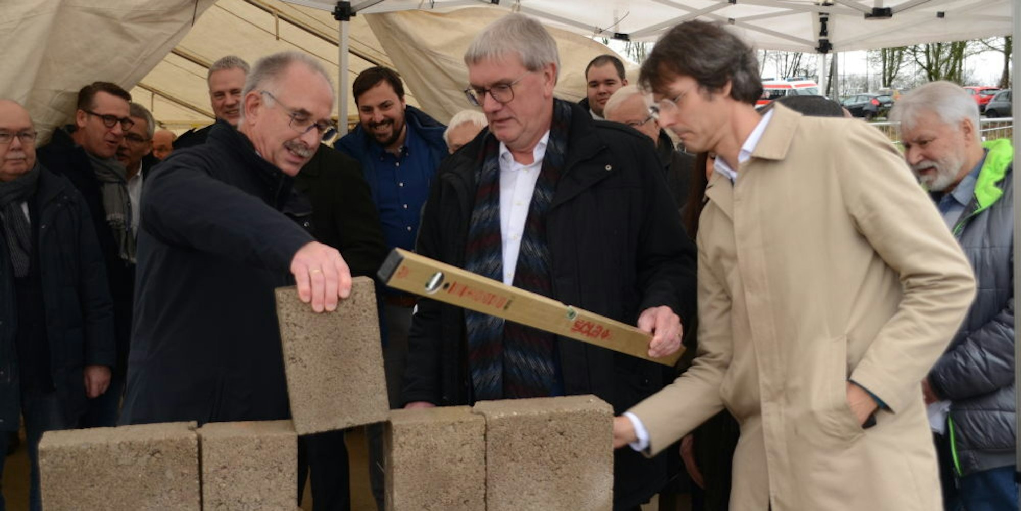 Sie üben noch: Norbert Büscher, Sebastian Schuster und Architekt Christoph Rütter bei der Grundsteinlegung.