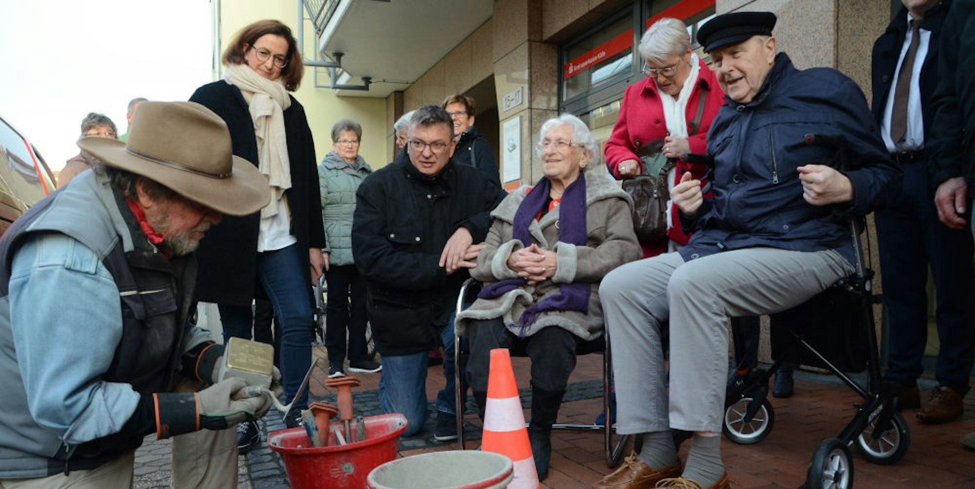 „Im Telefonbuch“ habe er sie gefunden, erzählte Georg Langen vor dem Gebäude der Kreissparkasse, das heute am Platz des kleinen Hauses steht. Als Lehrer am Kopernikus-Gymnasium forscht er seit Jahren mit seinen Schülern zu den Jahren des Terrors in Niederkassel. „Verschreckt“ habe Karola Adami damals auf seinen Anruf reagiert, für eine Ausstellung im Rathaus schützte sie sich mit dem Namen Elisabeth Schindler. „Es gibt noch Nazis, die stecken dir das Haus an“, sei sie damals gewarnt worden, erzählt die rüstige 94-Jährige.