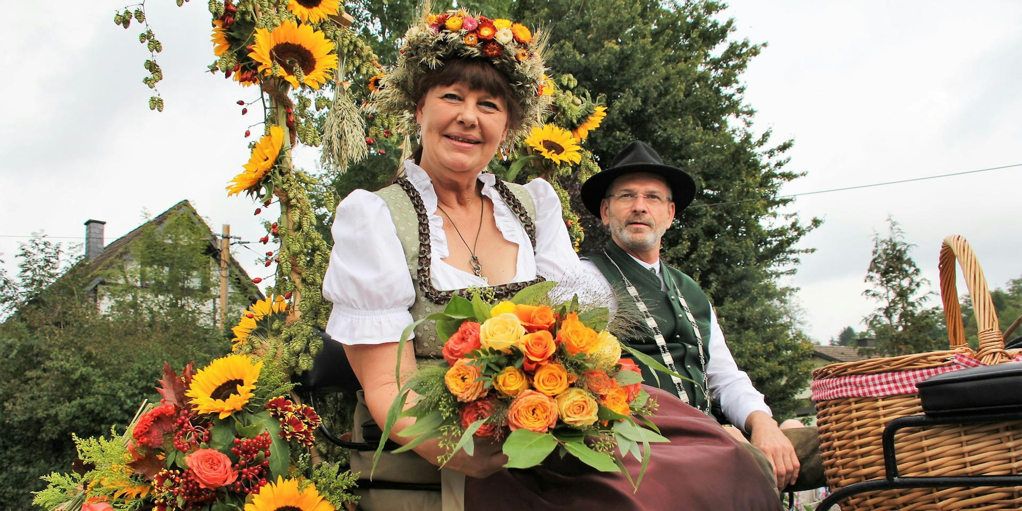 Kartoffel, Lauch, Zwiebel, Kürbisse, Mais und Sonnenblumen, und kein Erntefest ohne Umzug. Und so zogen am Sonntag in Eitorf wieder viele prall und bunt geschmückte Erntewagen durch das Ottersbachertal zur Festhalle in Kehlenbach. Am Ende die Kutsche mit einem strahlenden Erntepaar: Beatrix und Peter Wieland repräsentieren den Ernteverein Ottersbachertal in diesem Jahr. Die 56-jährige Verwaltungsfachwirtin und der 57 Jahre alte Tischler wohnen im Eitorfer Ortsteil Rodder.
