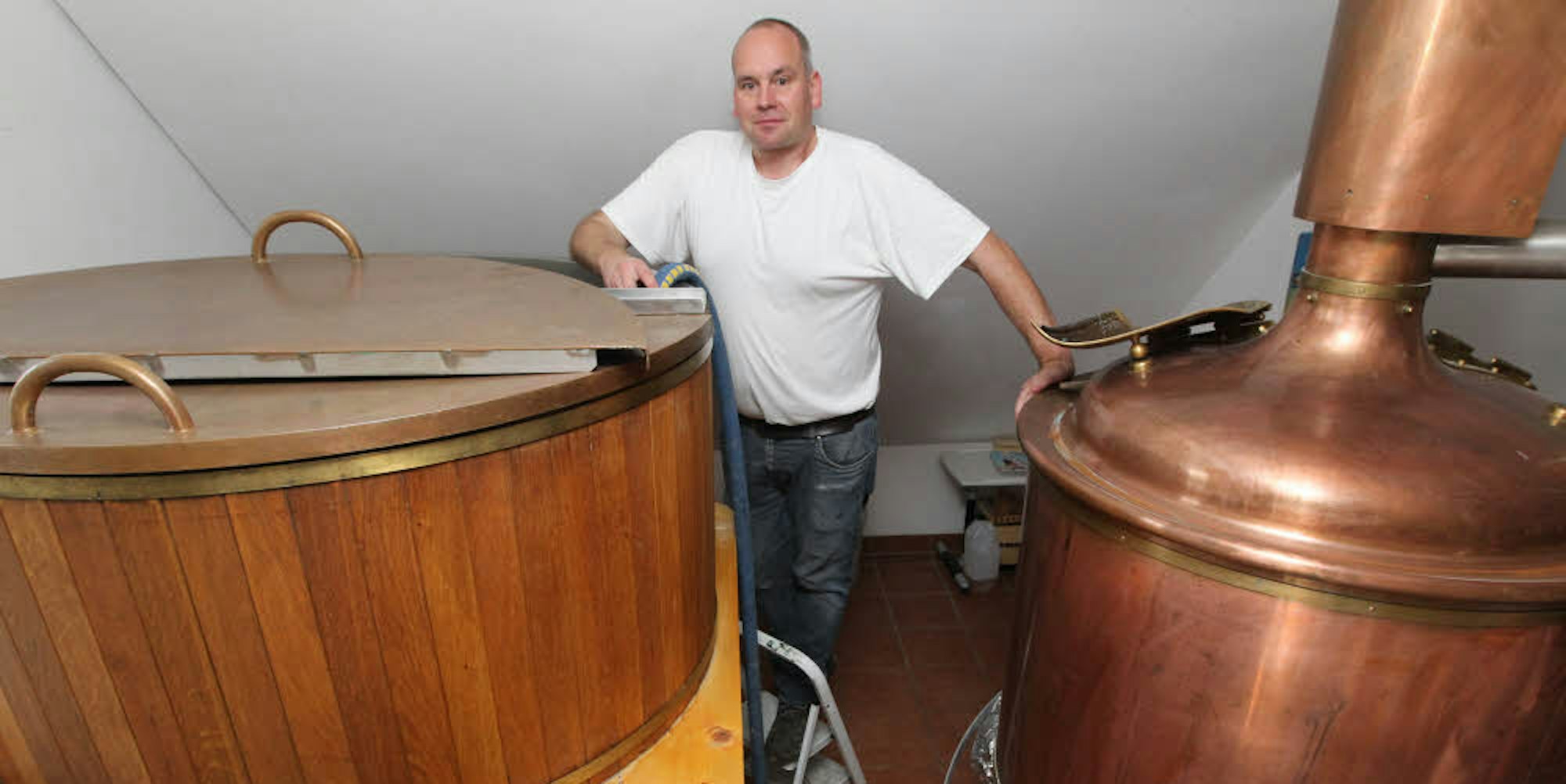Schambil hat umgebaut, die im Internet entdeckte Brauanlage installiert und vor zwei Jahren mit dem Hobby-Brauen angefangen. Sofort fallen die kupferne Sudpfanne und der hölzerne Läuterbottich ins Auge. Aber es riecht nicht nach Brauerei.