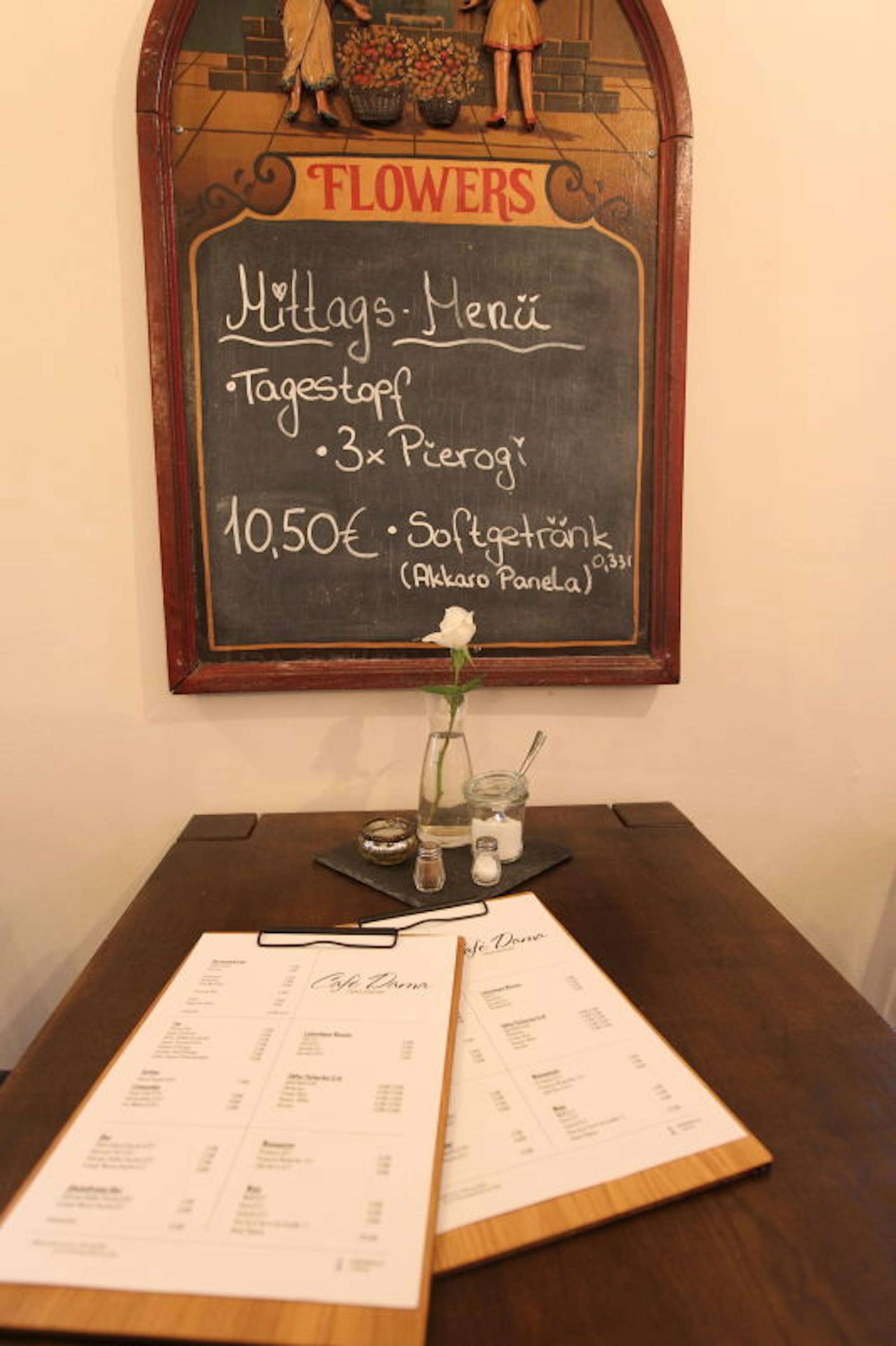 Eine Tafel preist den „Tagestopf“ an: drei Pierogi und ein Softgetränk für 10,50 Euro. Die Pierogi – mit weißem Käse, Zwiebeln und Kartoffelpüree gefüllte Teigtaschen – bereitet Marcelina Kehl zu. Die gebürtige Polin kann dabei auf eine Rezeptsammlung ihrer Großmutter zurückgreifen. Während die 26-Jährige in der Küche steht, widmet sich Daniel Kehl dem Service. Bis zu 40 Gäste finden im Café Dama an den kleinen Tischen und an Hochtischen Platz. Im Sommer lockt außerdem eine Terrasse.