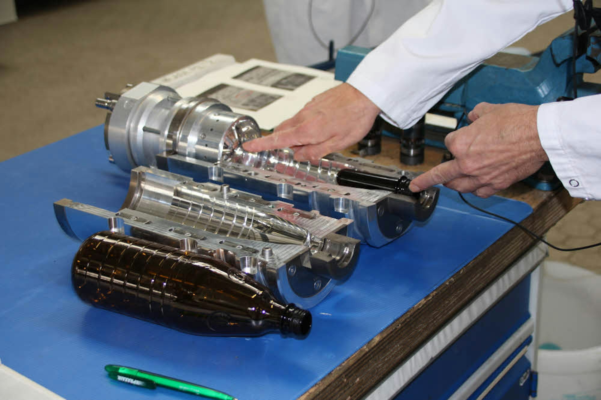 In einer Form wird der kleine „Peton“ (r.) gezogen und mit Pressluft bei einem Druck von 32 Bar zur Ein-Liter-Flasche aufgeblasen.