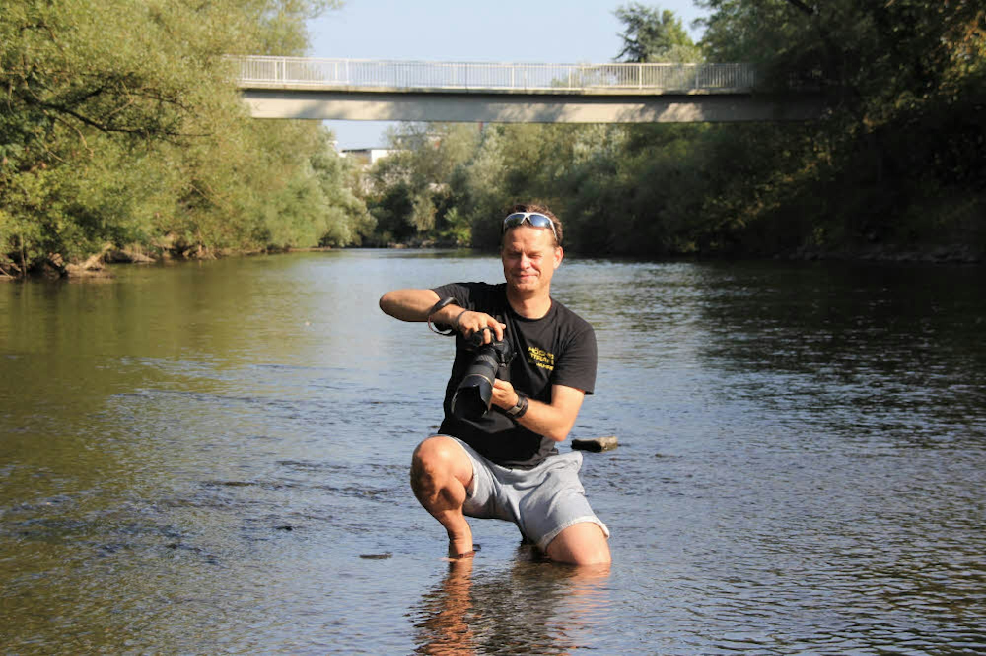 Auch Michael Wagner ließ sich darauf ein. Mit einem Stapel Bücher auf dem Arm marschierte der Krimiautor und Künstler von Hennef durch den Fluss nach Allner. Wagner hat weitere Ideen, will Impulse setzen und betrachtet die Aktion mit der gebotenen Ernsthaftigkeit, aber auch mit Humor. „Hennef hat so viele kreative Köpfe; in Richtung Kunstaktion geht hier noch eine Menge“, zeigt er sich zuversichtlich. So hält er – „mal ins Blaue gesprochen“ – einen Ponton als Zwischenlösung für durchaus denkbar, „statt vier Jahre oder länger auf die neue Brücke zu warten“.