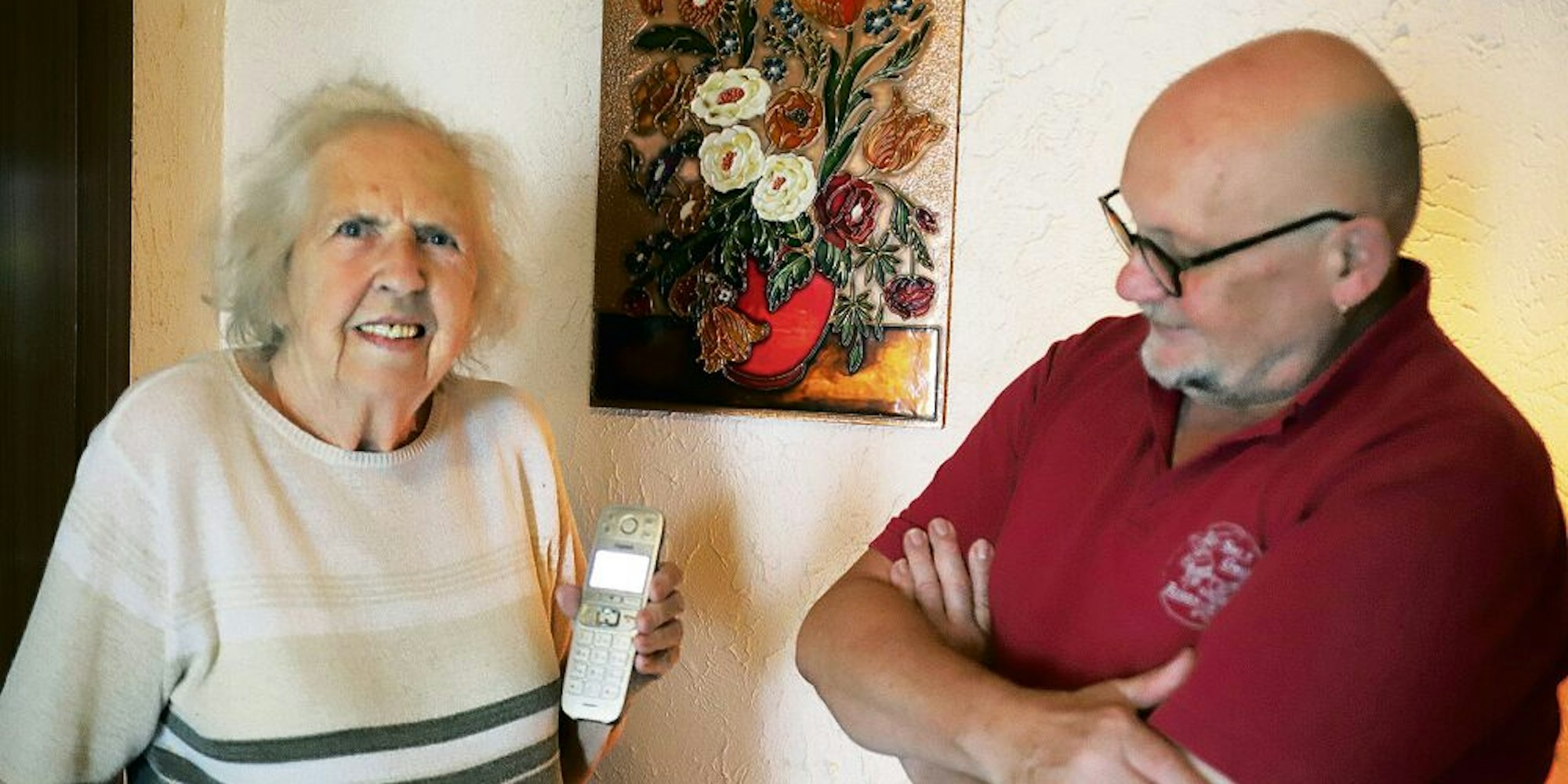Eine defekte Stelle sei nun gefunden, hieß es in einer Nachricht. Dann verhinderten die Unwetter in Hennef eine zügige Reparatur. Immerhin erhielt die Seniorin ein Handy. Doch trotz der Bitte von Martina Clauß um ein Gerät mit großen Tasten kam nur ein Standardgerät an, mit dem Barbara Weiß nicht zurechtkommt – zu klein sind die Bedienelemente.