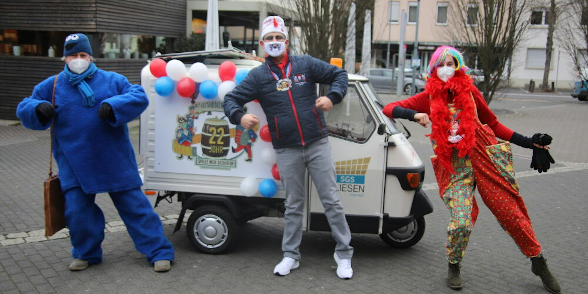 Auf dem Stadtsoldatenplatz wärmen wir uns beim Stippeföttche mit der allzeit dazu bereitstehenden Bronzestatue auf, als Stadtsoldat „Dilledopp“, Gerd Schichel, mit seiner Ape vorfährt. Der dreirädrige Transporter namens Luigi, geschmückt mit Luftballons, ist im Karnevalsmodus. Kölsche Musik schallt aus dem Koffer, wir haken uns andeutungsweise ein und schunkeln eine Runde auf Abstand. Karsten Moers und Annika Husarek, die vorbeikommen, signalisieren Solidarität mit konfetti-bunten Mund-Nase-Masken. „Irgendwas muss man doch tun“, sagt Husarek lachend.