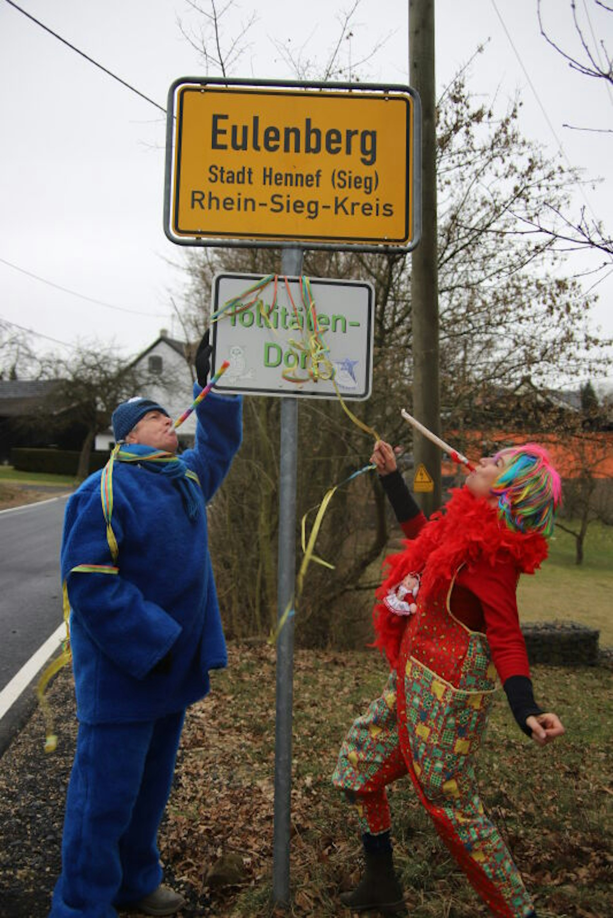 Weiter geht es in eine weitere Karnevalshochburg: 2019 wurde Eulenberg zum Tollitäten-Dorf erhoben. Am Schild, an dem dies kundgetan wird, geben wir mit Luftschlangen und Trötchen noch einmal alles – aber: D’r Zoch kütt auch hier nicht, die Tollitäten lassen sich nicht blicken.