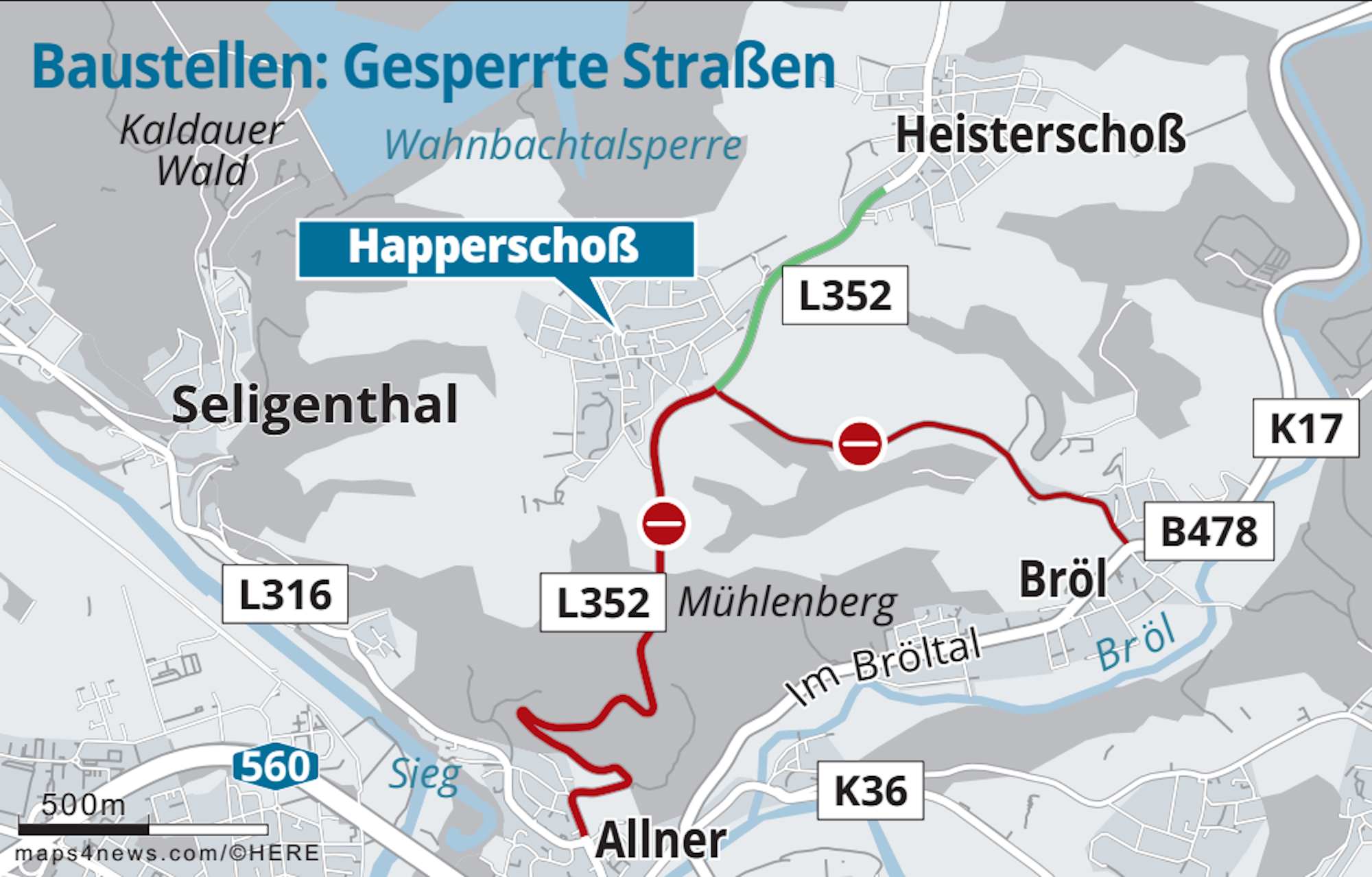 Hennef – „Das ist ein Unding.“ Joachim Rindfleisch (Die Unabhängigen), immerhin einer der Stellvertreter von Bürgermeister Klaus Pipke, Stadtverordneter und Bürger des Dorfes Happerschoß konnte es am Dienstag nicht fassen: Sein Heimatdorf wird mit dem Start der Sommerferien am kommenden Montag zur Sackgasse. Wer von Neunkirchen über die Landstraße 352 kommt, steht vor Sperrschildern. Richtung Allner erneuert der Landesbetrieb Straßen die Fahrbahn. Richtung Bröl baut die Stadt noch immer an Kanal und Straße.