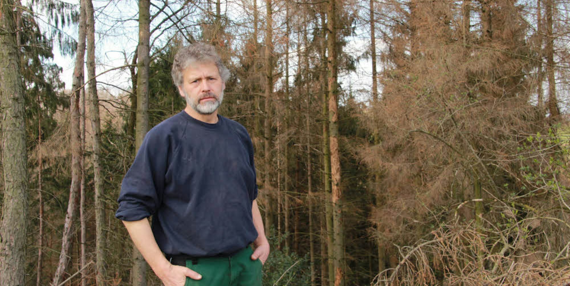 Schmitz steht am Rand seines Gemüsefeldes und blickt auf dürre, braune Äste und einsame Stämme, von denen sich die Rinde ablöst. „Diesen Wald hat mein Vater gepflanzt. Wahrscheinlich wird Ende des Jahres der komplette Bestand weg sein.“