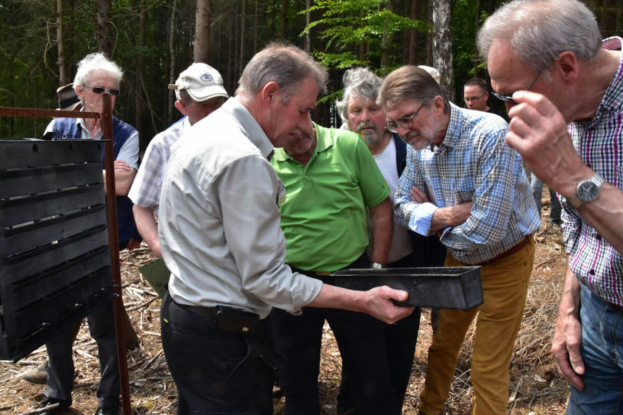 In den Fallen fängt Förster Gerhard Pohl (li.) pro Woche 6500 Kupferstecher und 15 000 Buchdrucker. Hier zeigt er sie den Waldbauern.