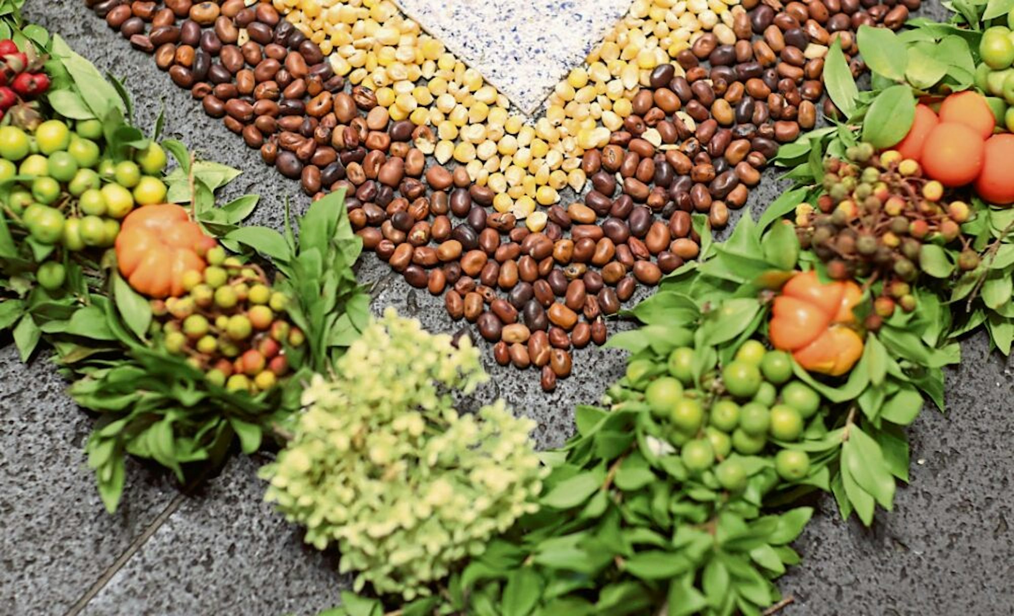 Das nächste Erstaunen folgt beim Betrachten aus der Nähe: Der sogenannte Erntedank-Teppich besteht aus Millionen von Getreidekörnern, Samen, getrockneten Blüten, Blättern und Hülsenfrüchten.