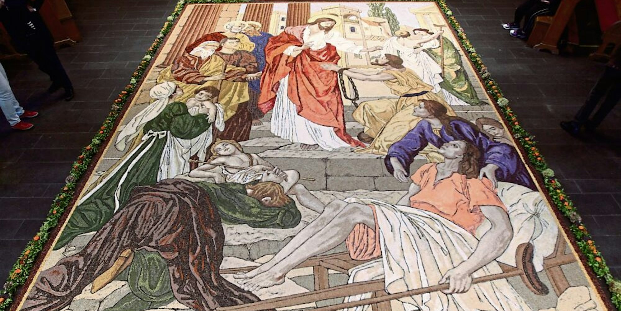 Hennef – Feine Nasen nehmen die Kräuter wahr. Wer dieser Tage die Hennefer Pfarrkirche St. Simon und Judas betritt, sieht nach einigen Schritten auch, woher der Duft kommt. Dann allerdings übertrumpft der optische Reiz alles. Die Augen verlieren sich in einem imposanten „Gemälde“, das farbenprächtig den Raum vor den Stufen zum Altar ausfüllt.
