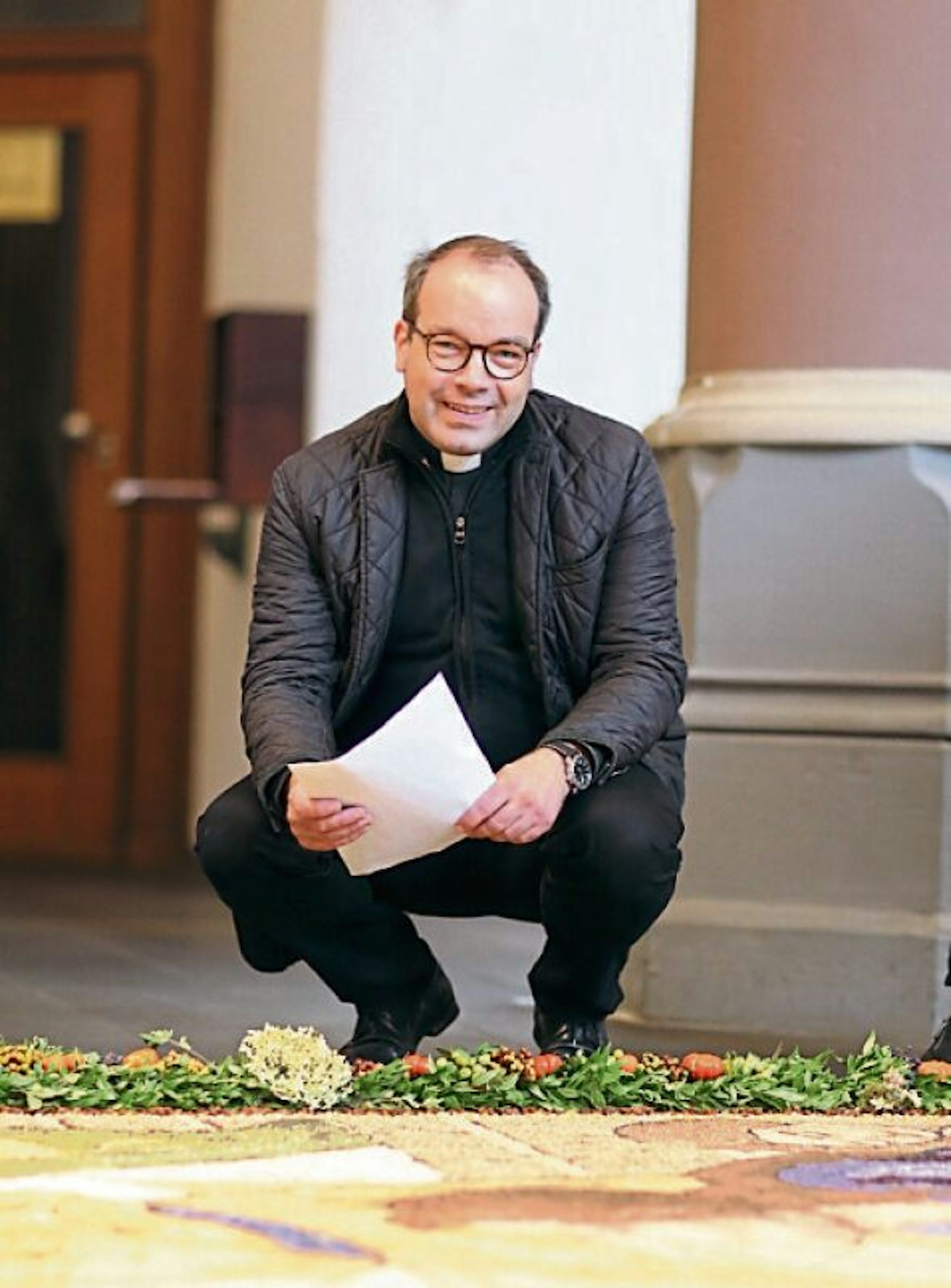 „Als ich Ende der 90er im Studium war, habe ich in einer Zeitung ein Körner-Mosaik gesehen“, erzählt der heute 49-Jährige. Er archivierte den Artikel, und als der ihm wieder in die Hände fiel, fragte er die Gemeindemitglieder, die bei der Gestaltung der Fronleichnam-Blumenbilder mitmachen: „Könnt ihr euch auch so etwas vorstellen?“