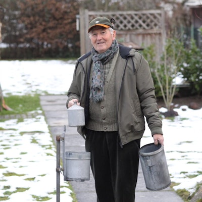 Mit seinem Regenmesser ermittelt Josef Bette (83) die Niederschlagsmenge pro Quadratmeter.