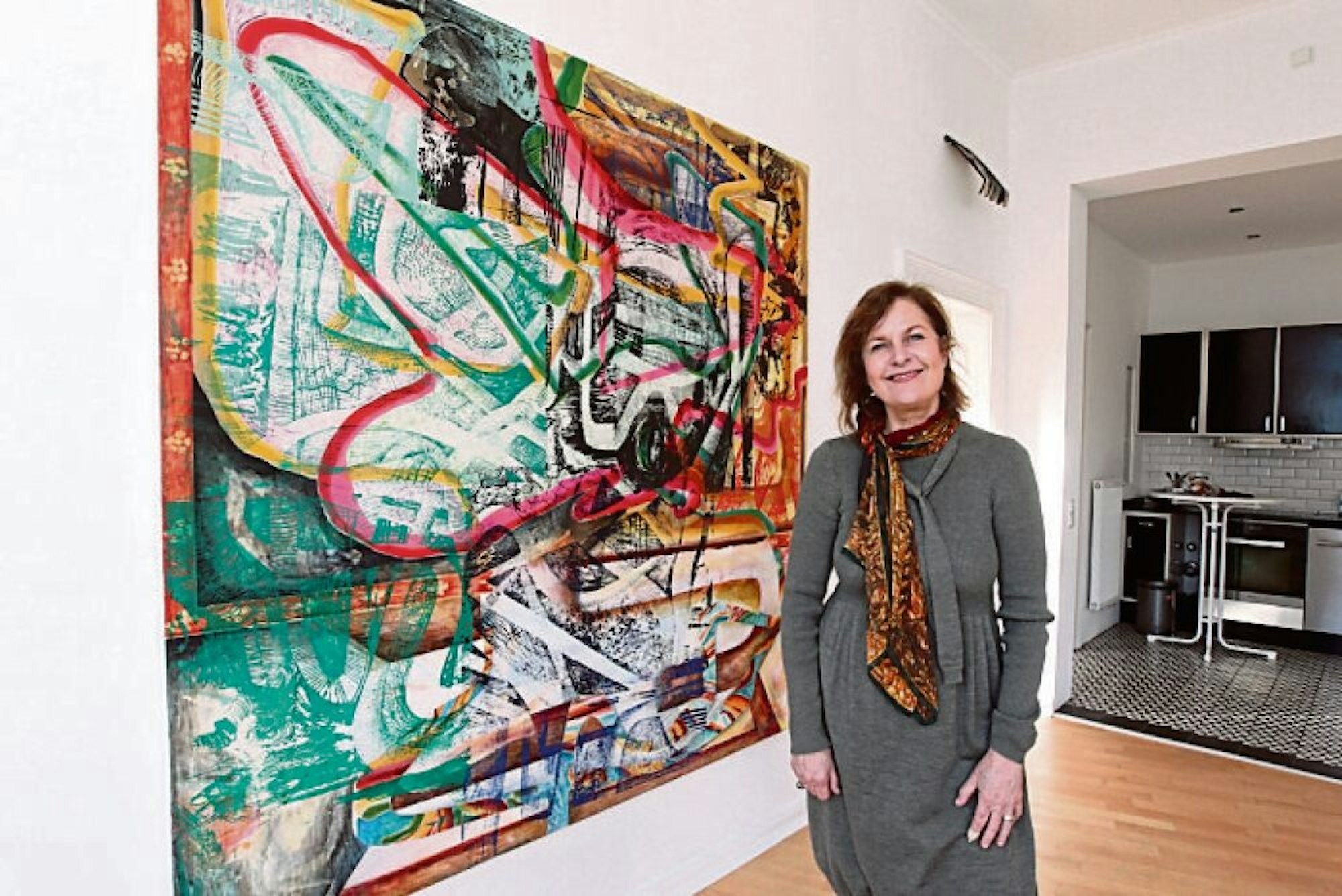 Die Galeristin Susanne Neuerburg hat in ihrer Hennefer Galerie zwei Künstler zu Gast. Hier steht sie vor einem Werk von Marco Zumbé.
