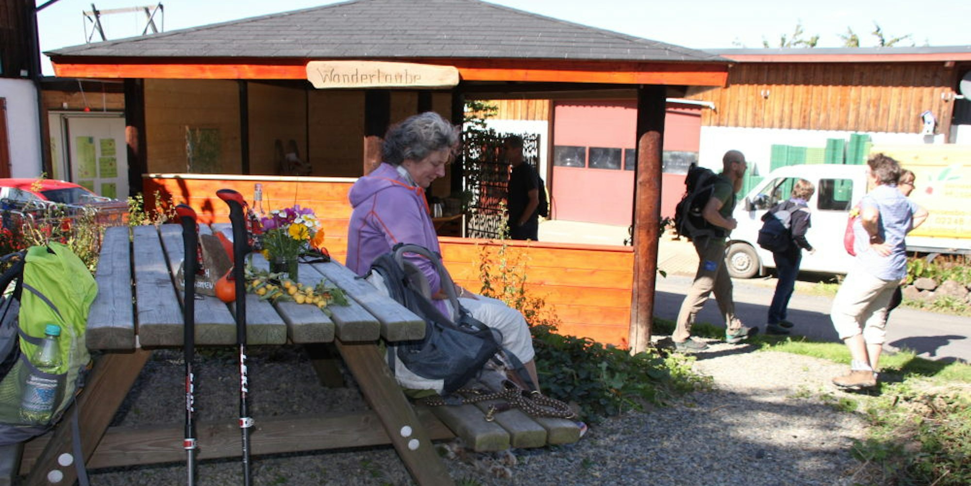 Hennef – Marianne Kihm sitzt gemütlich auf der Bank, Hund Davo genießt den Schatten. Die Wanderin hat eine Pause eingelegt auf der Etappe von Eitorf-Merten nach Stadt Blankenberg auf dem Natursteig Sieg. Sie ist auf dem Biohof Hüsgen gelandet. Die Familie hat nicht nur die Sitzgelegenheit aufgestellt, sondern auch eine Wanderlaube eingerichtet. Dort steht Bio-Limonade ebenso bereit wie heißes Wasser für Tee und Kaffee aus biologischem Anbau.