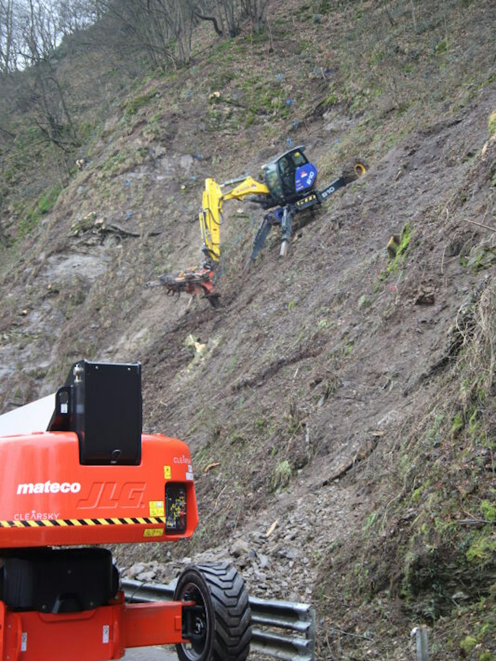 Ein Schreitbagger bohrt Löcher in den steilen Fels, an denen später Stahlnägel und -anker befestigt werden.