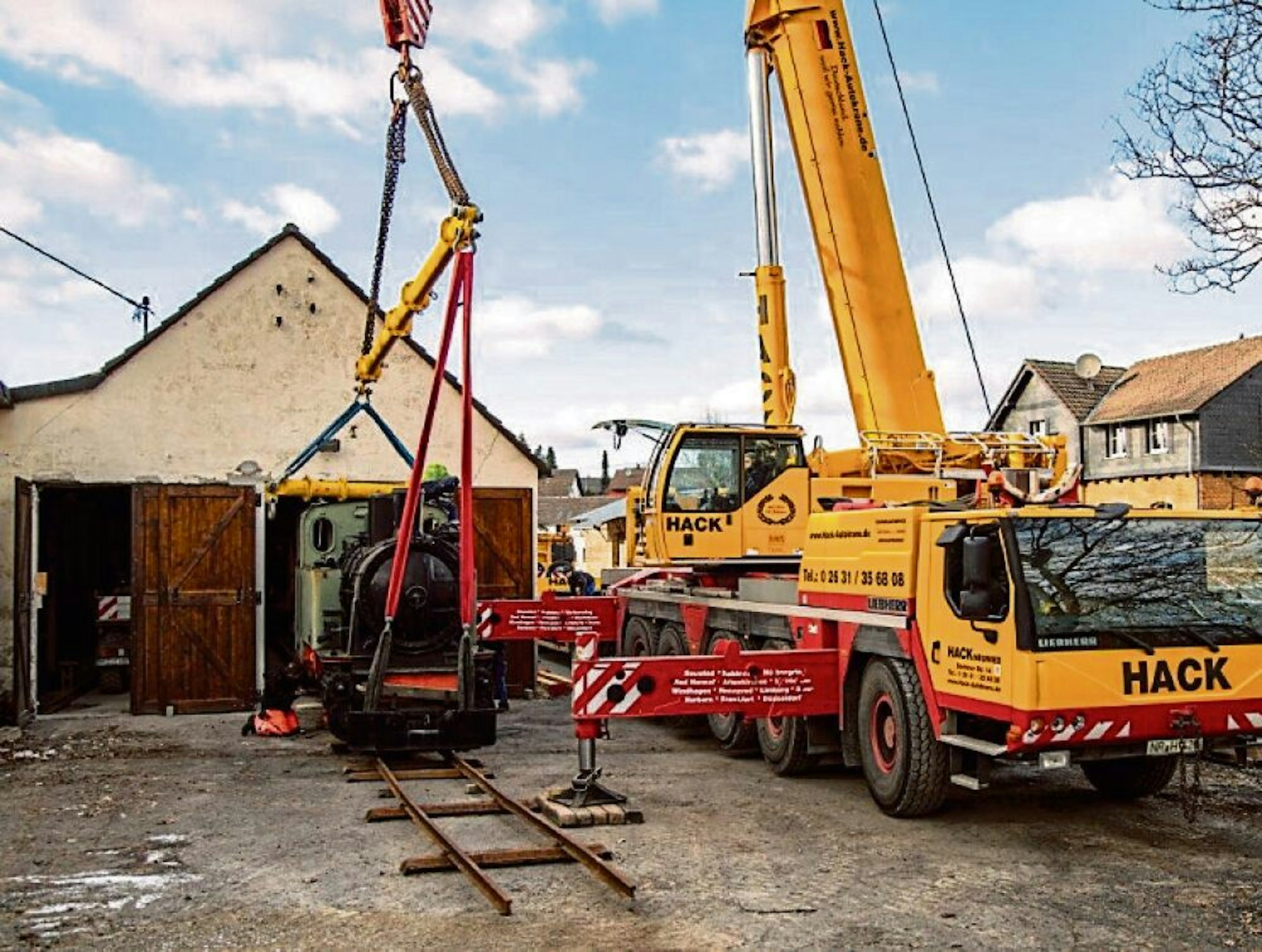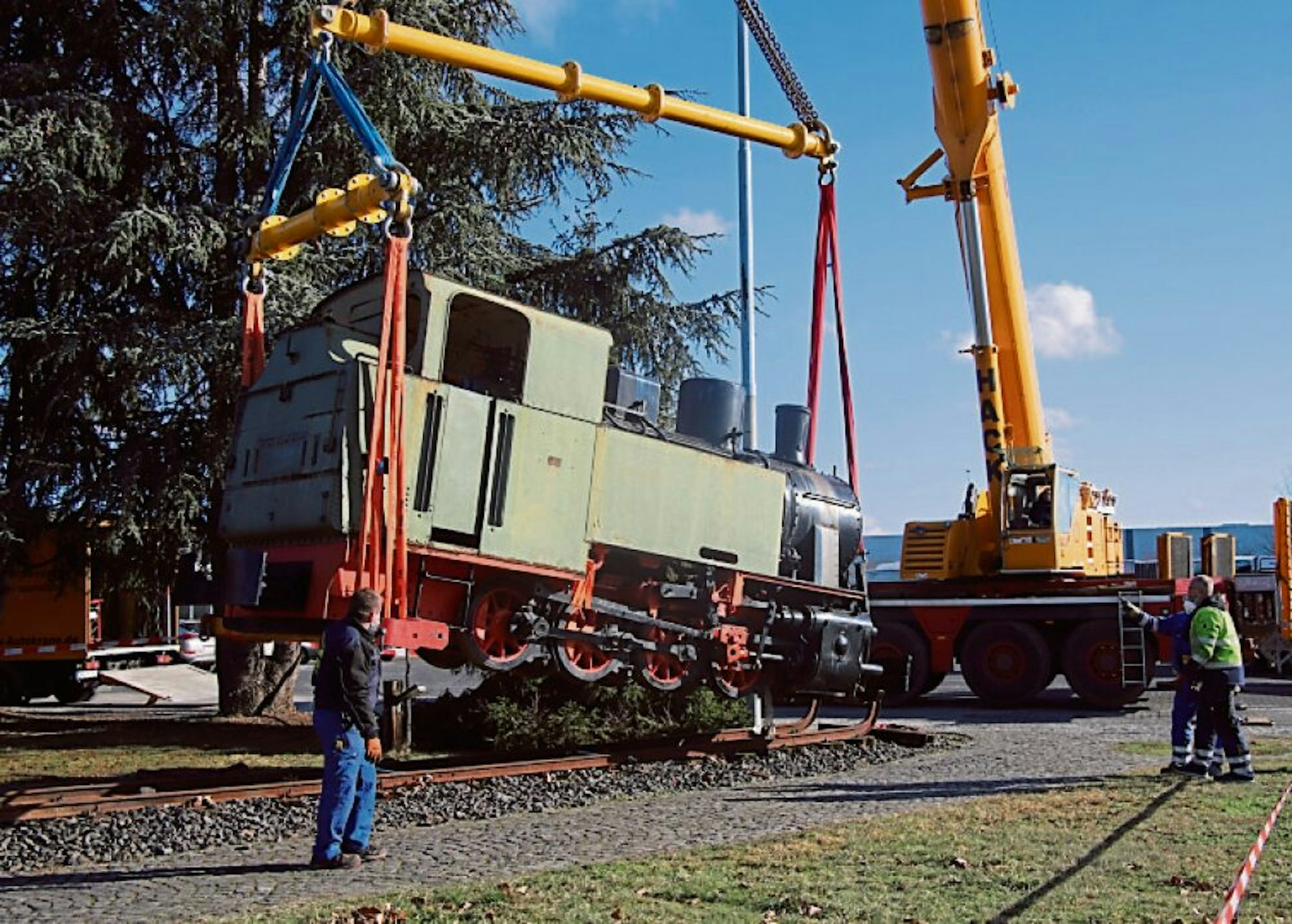 Bis zum Jahr 1968 war die Schmalspurlok unterwegs. Ein Kran hievte sie jetzt auf dem Betriebshof der RSVG in Hennef auf einen Schwertransporter. In Asbach wurde das Schmuckstück auf die eigens verlegten Gleise gesetzt.