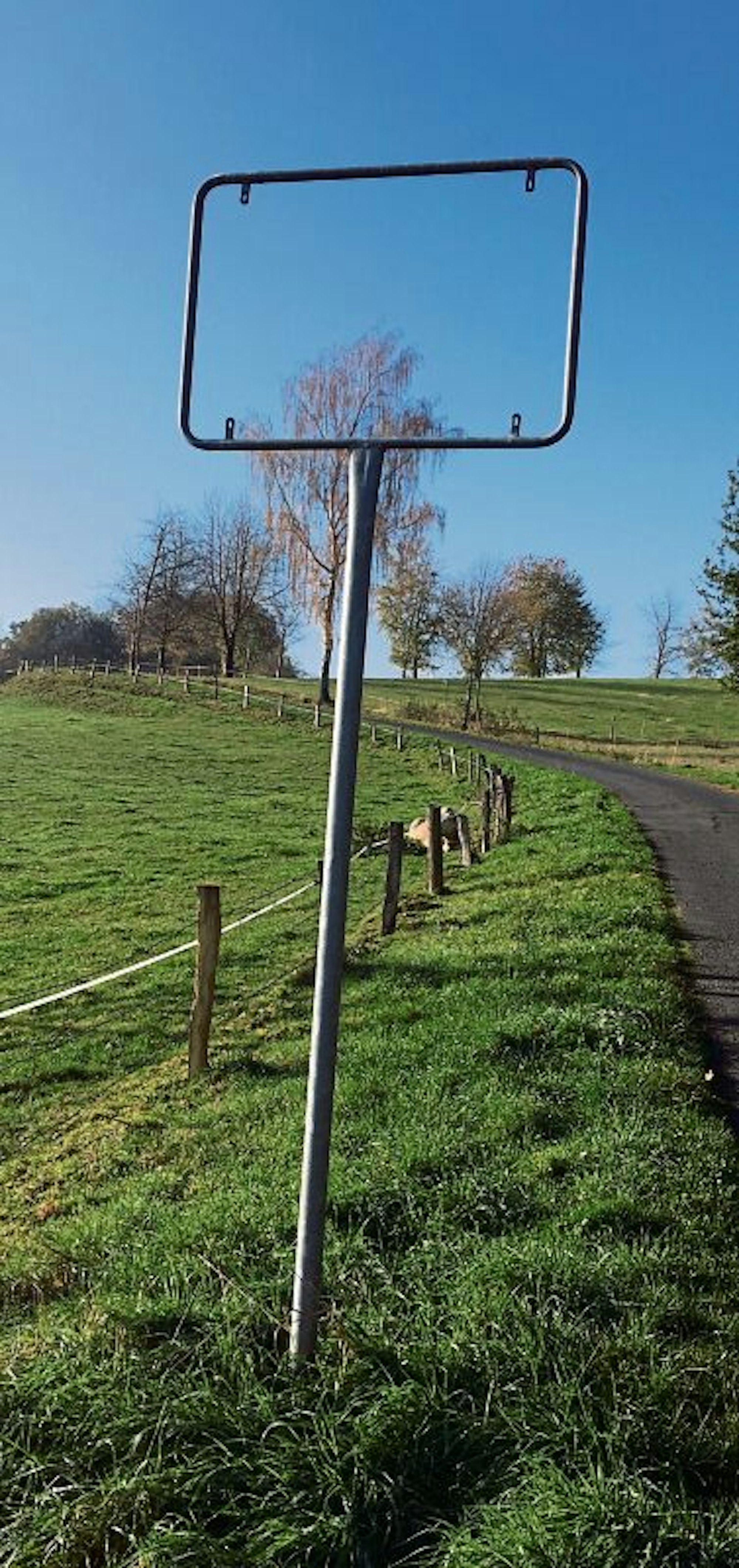 Hennef – Wie Sie sehen, sehen Sie nichts: Der legendäre Spruch von Hans-Joachim Kuhlenkampff drängt sich den Besuchern auf, die die Ortschaft Hanf betreten. Ein leerer Metallrahmen zeigt an, wo das Ortsschild eigentlich gelb hätte grüßen sollen. An einer der Ausfahrtstraßen des kleinen Dorfes greift ein anderer Spruch: Wer suchet, der findet. Nämlich den aus dem Boden gerissenen Metallpfahl mitsamt Betonfuß, der verbogen im dichten Gras des Banketts liegt. Der Rahmen: leer.