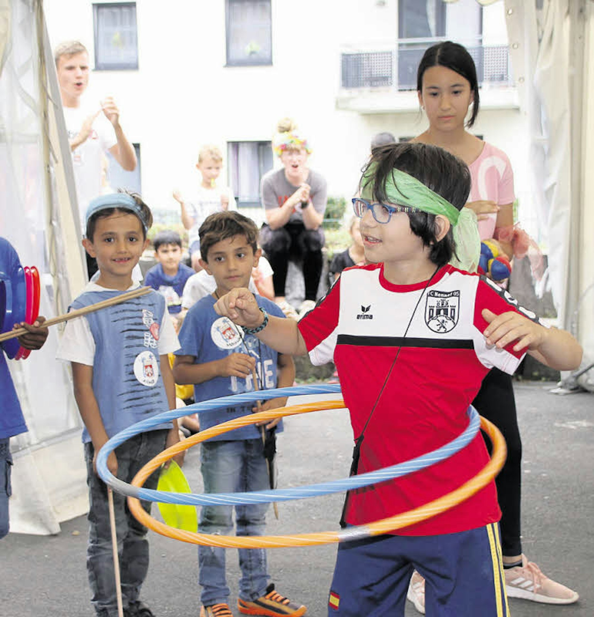 Hennef – „Sollen wir das nächstes Jahr wieder machen?“, fragte Beigeordneter Martin Herkt, nachdem er im Hula-Hoop-Wettbewerb nicht weit gekommen war. Ein lautes, vielstimmiges „Ja“ schallte ihm entgegen. Herkt war Gast beim Veedelfest zum Abschluss der ersten „Ferien-Veedel“-Woche. Seine „Kollegen“ hatten ihn durch den Jugendpark geführt, wo 80 Kinder fünf Tage lang ihre eigene Stadt lebten, Demokratie übten und eine Vielzahl von Berufen testeten. Außerdem konnte sie Schmuck basteln und kleine Täschchen schneidern.
