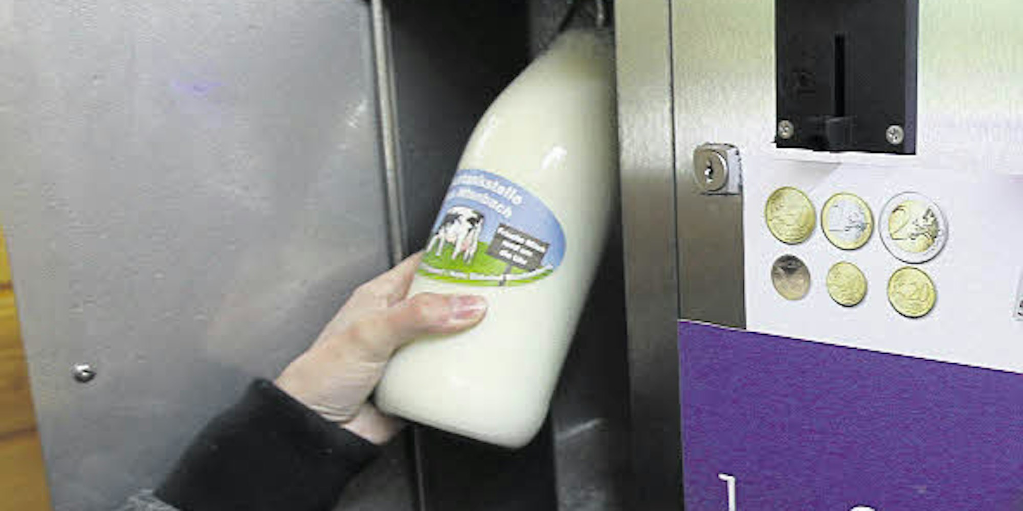 Ein kleiner Parkplatz ist angelegt, daneben steht das neue Holzhäuschen mit gefliestem Boden, Waschbecken und zwei Automaten. Wer kein eigenes Behältnis mitgebracht hat, geht zuerst nach rechts. Für 1,50 Euro kann man eine gekühlte Flasche ziehen. Mit der geht es an den links stehenden Automaten mit der ebenfalls gekühlten Milch. Der Liter kostet einen Euro. Der Apparat gibt Wechselgeld bis auf 20 Euro und einen Bon heraus, man kann auch für weniger als einen Euro Milch tanken.