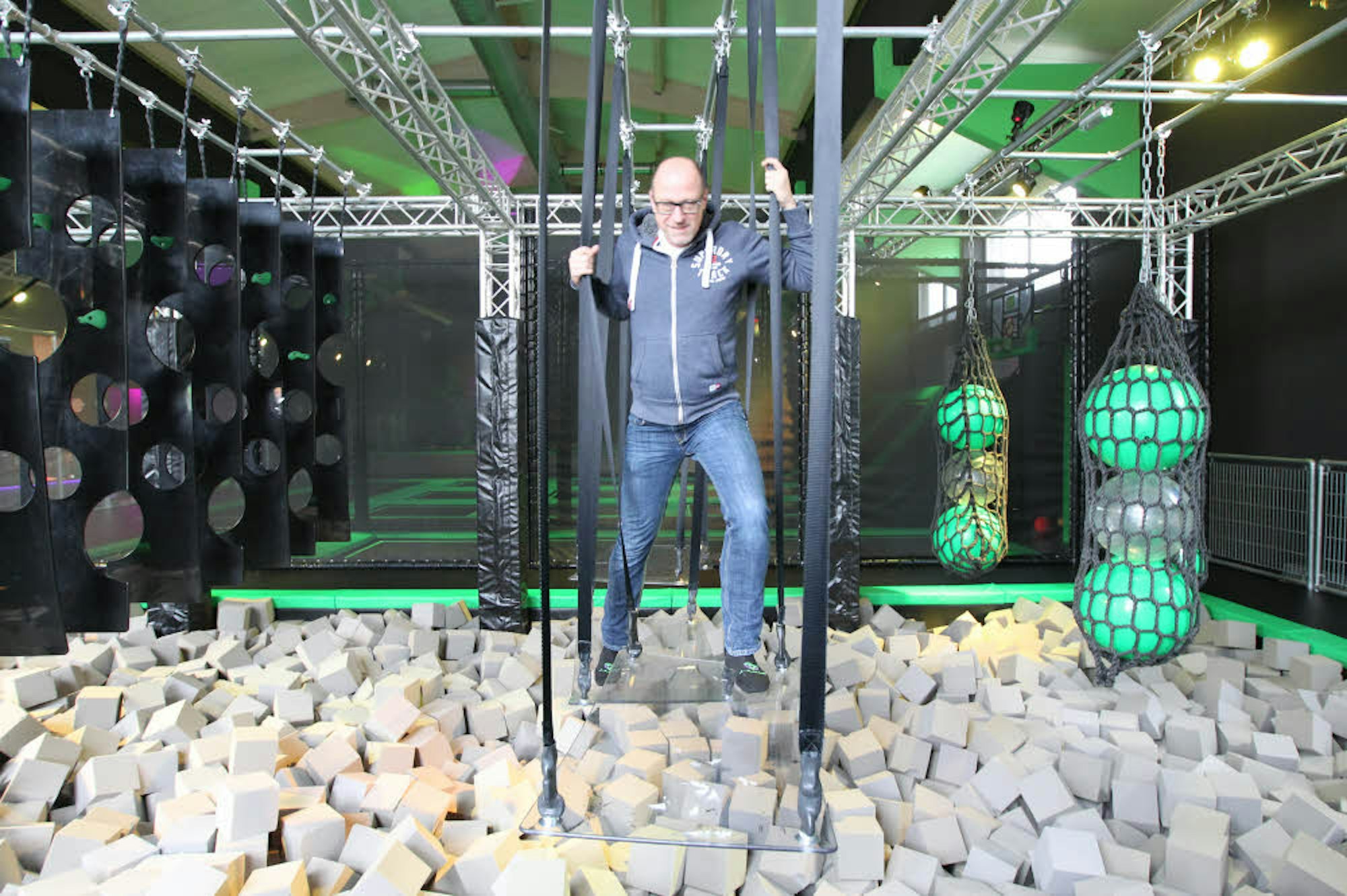 „Das Waterfall-Trampolin ist neben dem Ninja Parcours besonders beliebt“, sagt Geschäftsführer Hubert Schäfer. Nachdem der 18-Jährige trotz 104 Kilos schon mit einigen Salti auf der „Tumbling Lane“ beeindruckt hat, geht es zum „Waterfall“. Mit ein paar Sprüngen Schwung geholt, lasse ich mich in das 1,50 Meter tiefe, mit Schaumstoffklötzen gefüllte riesige Becken fallen. Mühsam krabbele ich wieder heraus.