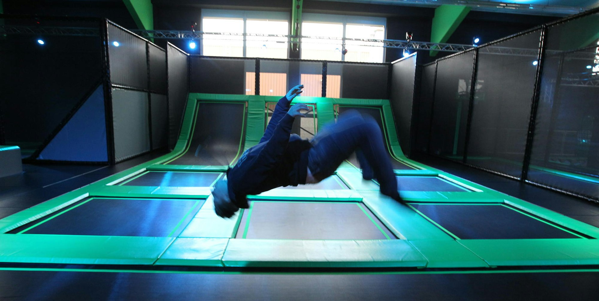 Doch meist tummeln sich auf den Trampolins Jugendliche, die von bis zu zwei der insgesamt 16 Mitarbeitern – mit Trillerpfeifen bestückt – überwacht werden. Durchsagen vom Band weisen die Jugendlichen auf ihre Sprungzeiten hin, und natürlich läuft Musik.