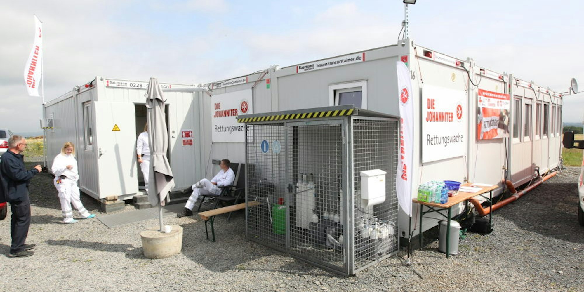 „Das ist ein anderer Container-Hersteller“, erklärt Johanniter-Fachbereichsleiter Ralf Marquardt. Auf ungefähr 15 mal 15 Metern und gut 200 Quadratmetern stehen den vier bis sechs Einsatzkräften im 24-Stunden-Dienst alle wichtigen Einrichtungen zur Verfügung. Dazu gehören ein klimatisierter Lagerraum, Wäsche- und Spindraum, Toilette und Dusche, ein kleiner Aufenthaltsraum mit Fernseher und Sofa, ein großer Aufenthaltsraum mit Küche sowie vier Schlafräume mit jeweils zwei Betten. „Die Container sind gemietet und individuell eingerichtet“, erklärt Marquardt zufrieden.