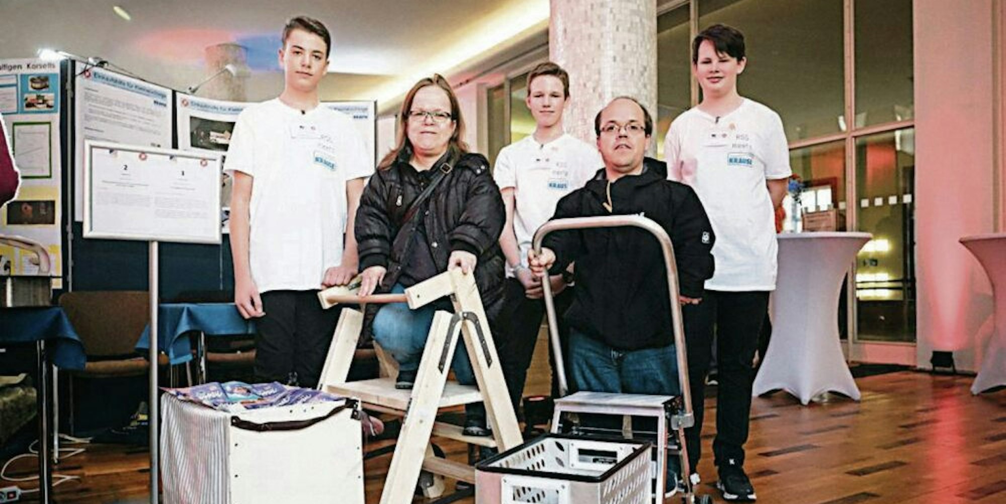Sankt Augustin – Kleine Menschen haben beim Einkaufen oft ein Problem. Sie kommen nicht an die Dinge in den oberen Regalen dran, müssen größere bitten ihnen zu helfen. Dank dreier junger Tüftler des Rhein-Sieg-Gymnasiums in Sankt Augustin ließe sich das Problem mit einem speziellen Einkaufsleiterwagen aus der Welt schaffen. Mit dem Prototyp jedenfalls haben die drei Neuntklässler Felix Möller, Benjamin Scholer (beide 15) und Jonas Mauelshagen (14) am Mittwoch den Landeswettbewerb „Jugend forscht“im Fach „Arbeitswelt“ gewonnen.