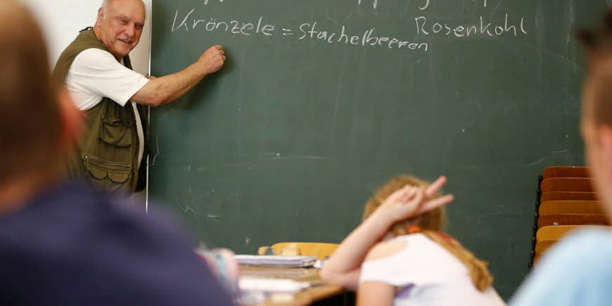Lohmar – „Jetzt kommen wir zum Essen“, sagte Volker Gröbe. „Juhu“, jubelte der 13-jährige Bastian. Aber es gab nichts zum Mampfen in dem Klassenraum. Vielmehr fragte der Kölsch-Lehrer: „Was ist ein halver Hahn?“ Kurzes Grübeln bei den Schülern. Dann antwortete die elfjährige Ayleen: „Ein Brötchen mit Käse.“
