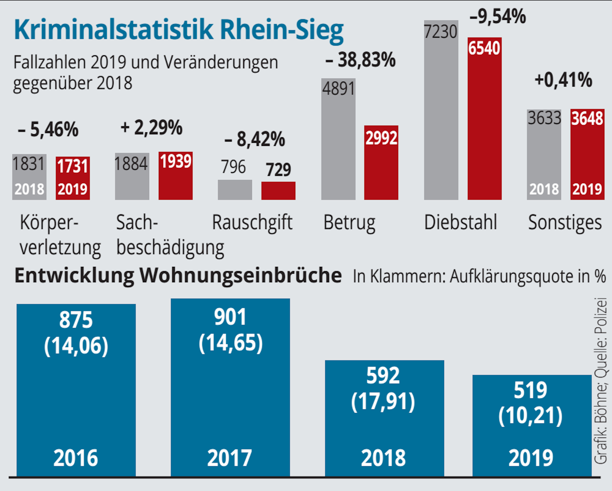 Rhein-Sieg-Kreis – 17 579 registrierte Straftaten gab es 2019 im rechtsrheinischen Kreisgebiet (ohne Bad Honnef und Königswinter). Dieses „erfreuliche Rekordtief“ verkündeten Landrat Sebastian Schuster und der Leiter der Polizeidirektion Kriminalität, Dirk Schuster, am Montag bei der Vorstellung der neuen Kriminalstatistik.