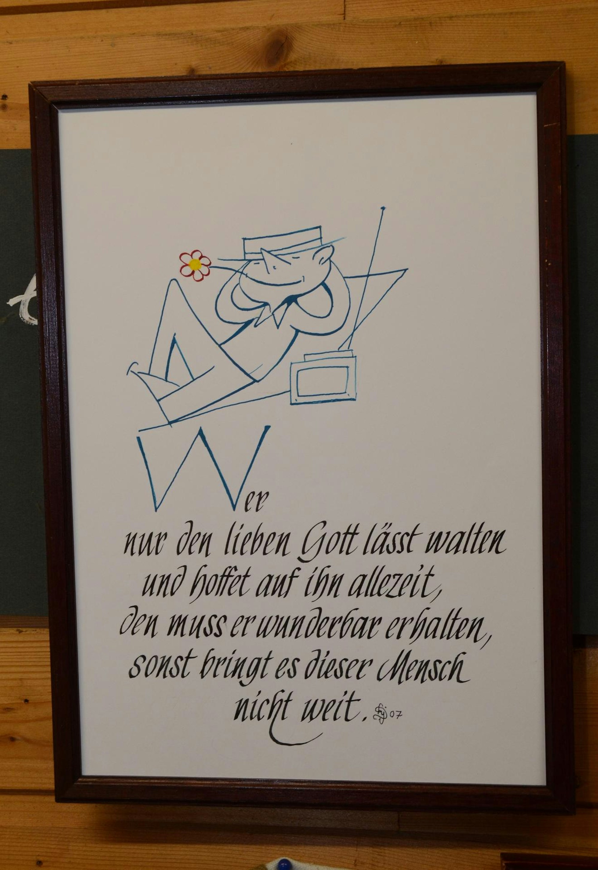 Bevor er zu schreiben beginnt, gilt es im Nachdenken, die passende Schrift zum Inhalt auszuwählen, die Farbgestaltung zu planen. Schriften wie Copperplate oder Anglais erfordern viel Ruhe, die der Pensionär am Schreibtisch schon nach wenigen Minuten findet, auch wenn mit 80 Jahren die Hand nicht mehr so ruhig ist wie früher.