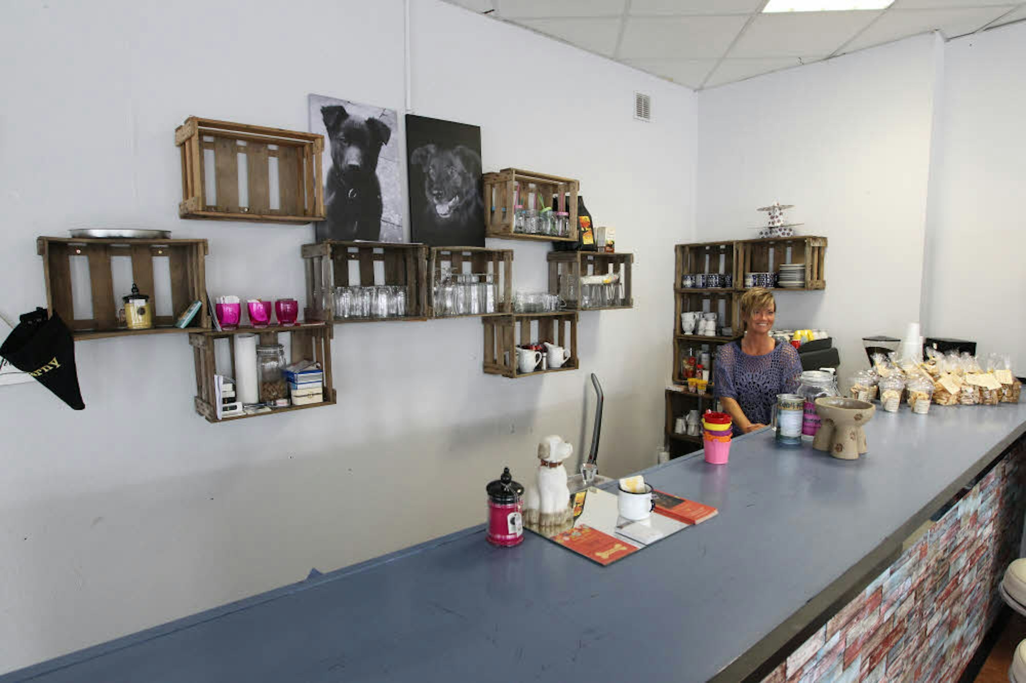 Nicole Müller hinter der Theke des „Café für alle Felle“ in Lohmar, das mit Leckereien für Zwei- und Vierbeiner lockt.