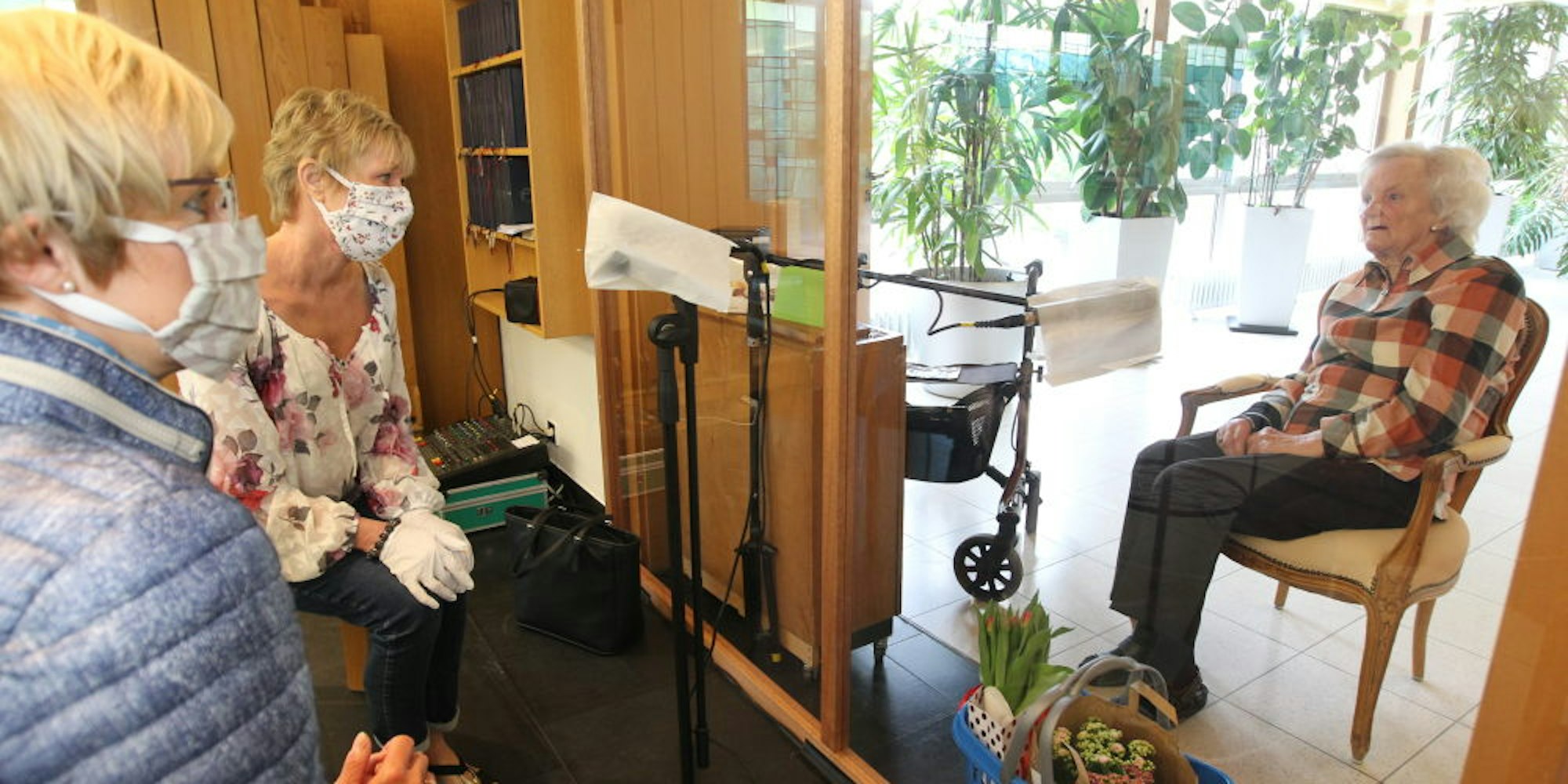 Eine Plexiglasscheibe trennt Thea Rensing (rechts) von ihren Töchtern Iris Rensing (links) und Petra Rink, die ihr zum 86. Geburtstag gratulierten. Geschützte Mikrofone übertragen die Stimmen aus der Kapelle in den Besuchsraum und zurück.