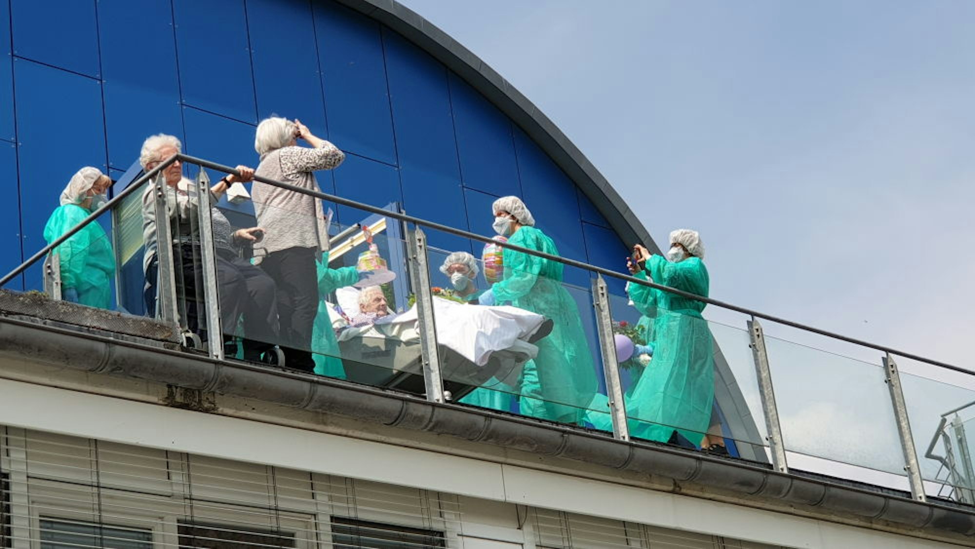 Auf der Terrasse feierte das Heim den Geburtstag eines 100-Jährigen, der mittlerweile von Corona genesen ist. Die Angehörigen durften dazukommen – über die Feuerleiter.