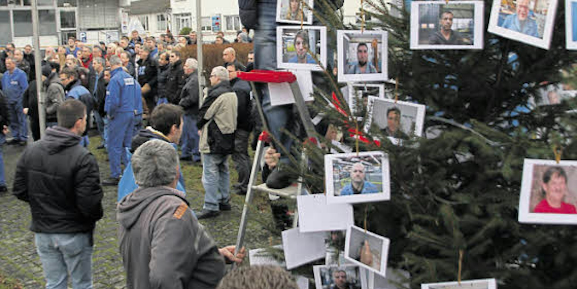 Die Belegschaft der Sulzer AG protestiert mit einer symbolischen Baumschmück-Aktion gegen Schließungspläne.