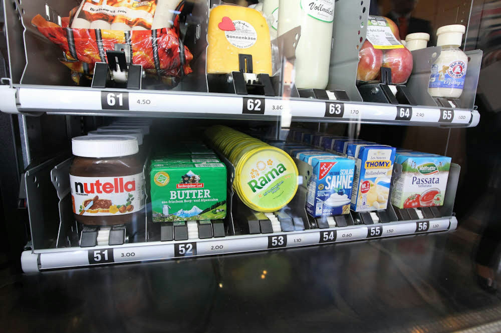 Der Mensch drückt eine Nummer am mannshohen Automaten, wirft das Geld ein und kann die Ware, die mit einem fahrbaren Regal sanft hinab transportiert wird, aus dem Ausgabefach entnehmen.