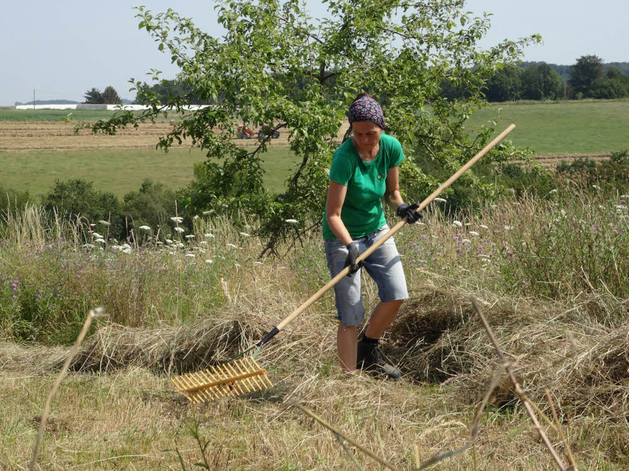 Schöne Blüten: Aus dem Heilziest kann man Tee zubereiten. Nicole Muthesius schichtet mit dem Rechen das Heu auf.