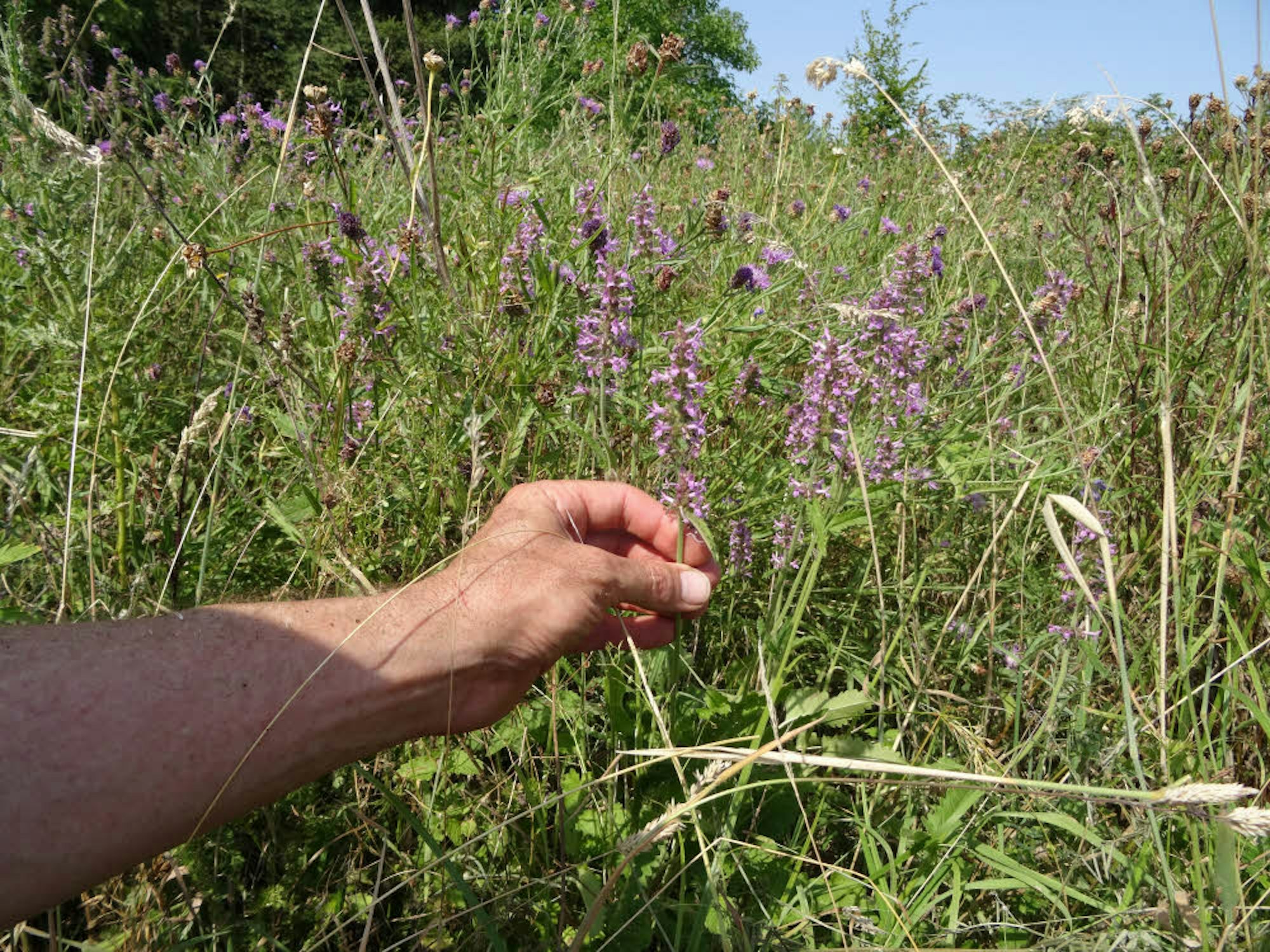 Das frühere Maisfeld hat sich in eine bunte Oase verwandelt, die im Kontrast zur monochrom grünen Wiese nebenan besonders auffällt. Farbflecke in Lila, Rosa und Weiß wogen zwischen Straußgras, Zittergras und Glatthafer. Heilziest, Storchschnabel, Margeriten und wilde Möhre blühen. Das wiederum lockt die Insekten, sich hier niederzulassen. Augenfällig ist dies vor allem durch die zahlreichen Ameisennester.