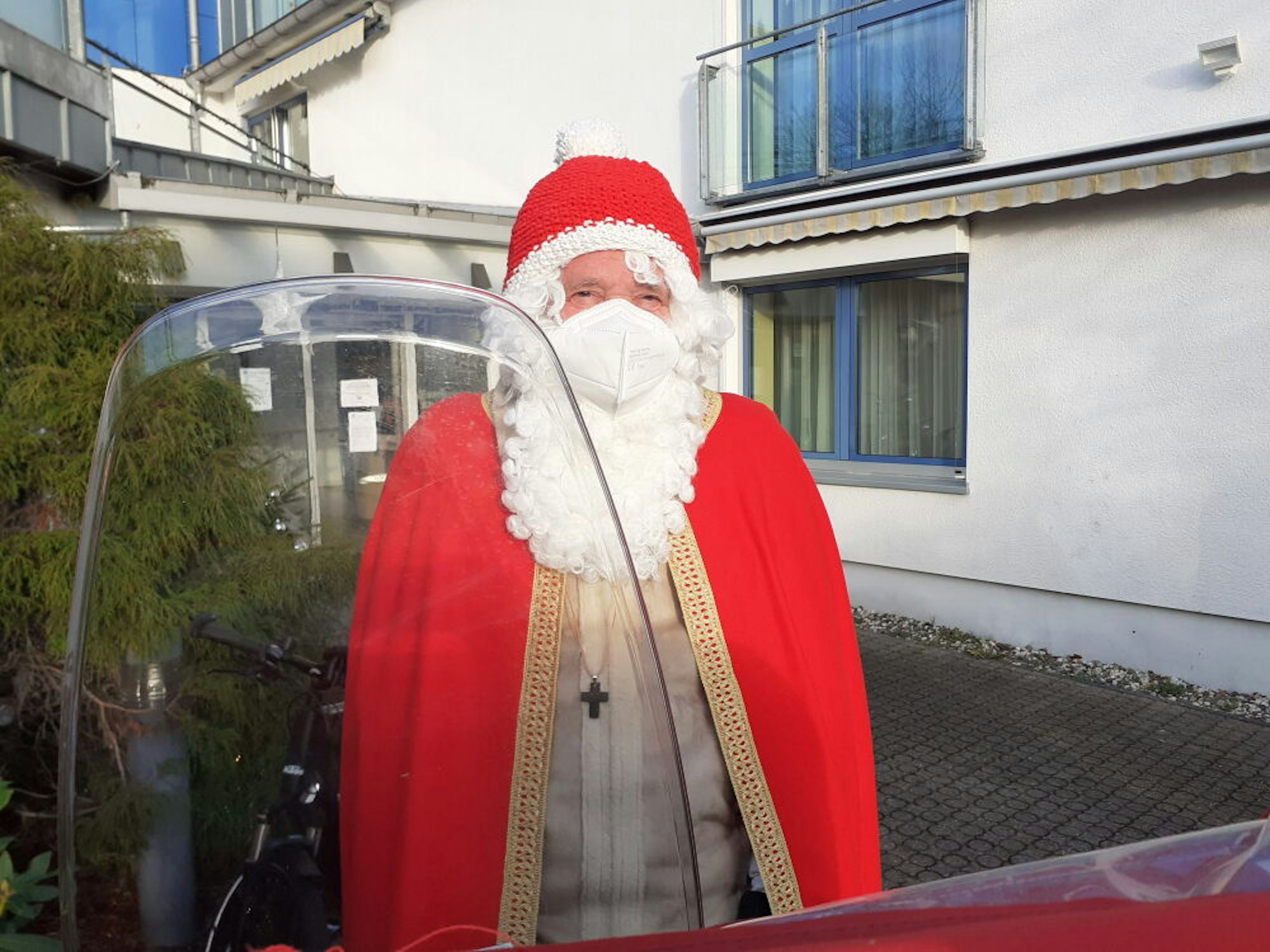 Lohmar – Die Mitra hätte dem Fahrtwind nicht standgehalten. So hat Horst Lubosch, 64, zum Gewand des Heiligen Nikolaus eine rote Bommelmütze über die Ohren gezogen, „gestern Abend fertig gestrickt von meiner Frau“. Mit seinem Kumpel, dem Weihnachtsmann, gemimt von Walter Przikling, 53, hat er vier ältere Damen an diesem 6. Dezember eingeladen zu einer Aufsehen erregenden Rikschafahrt.