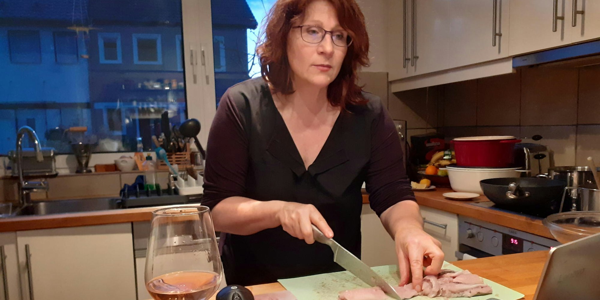 Denn anders als in den analogen Kochkursen, wo Kleingruppen die einzelnen Gänge zubereiten und anschließend gemeinsam an einem Tisch gegessen wird, können die Aufgaben im Online-Event nicht aufgeteilt werden; jede macht alles.